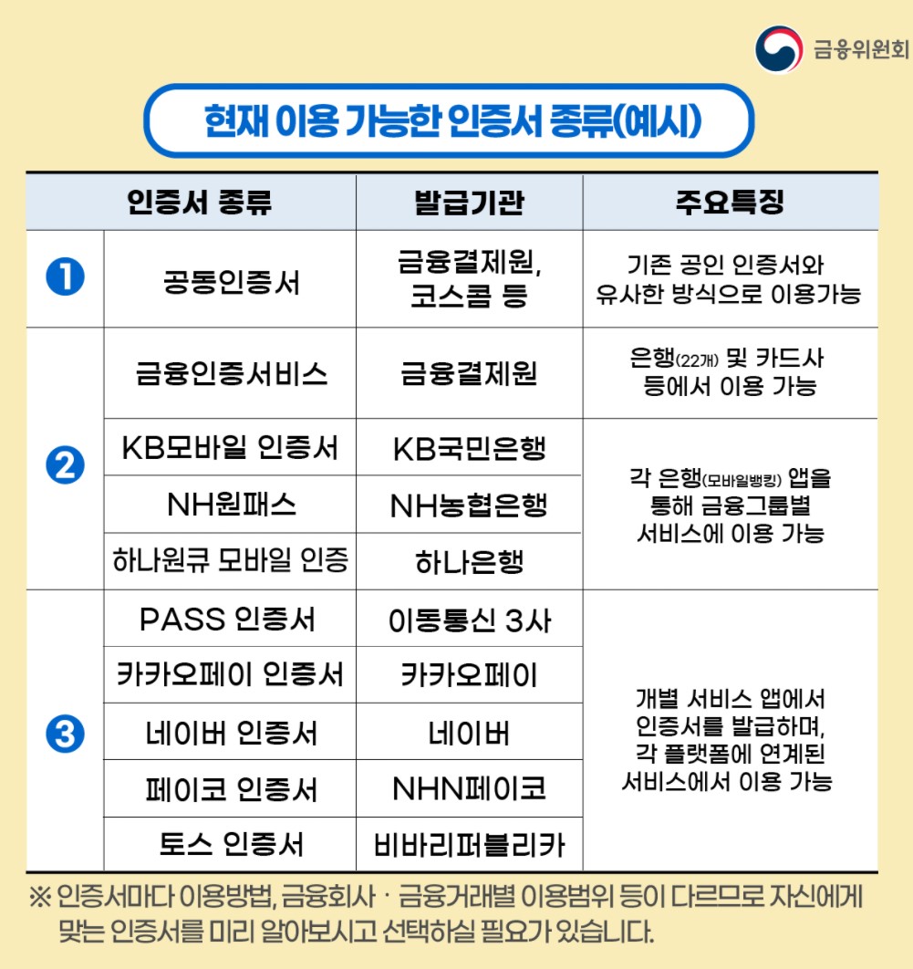 ※ 이용방법, 금융회사·금융거래 별 이용범위 등이 각기 다르기에, 본인에게 맞는 인증서를 알아보고 선택할 필요가 있습니다.
