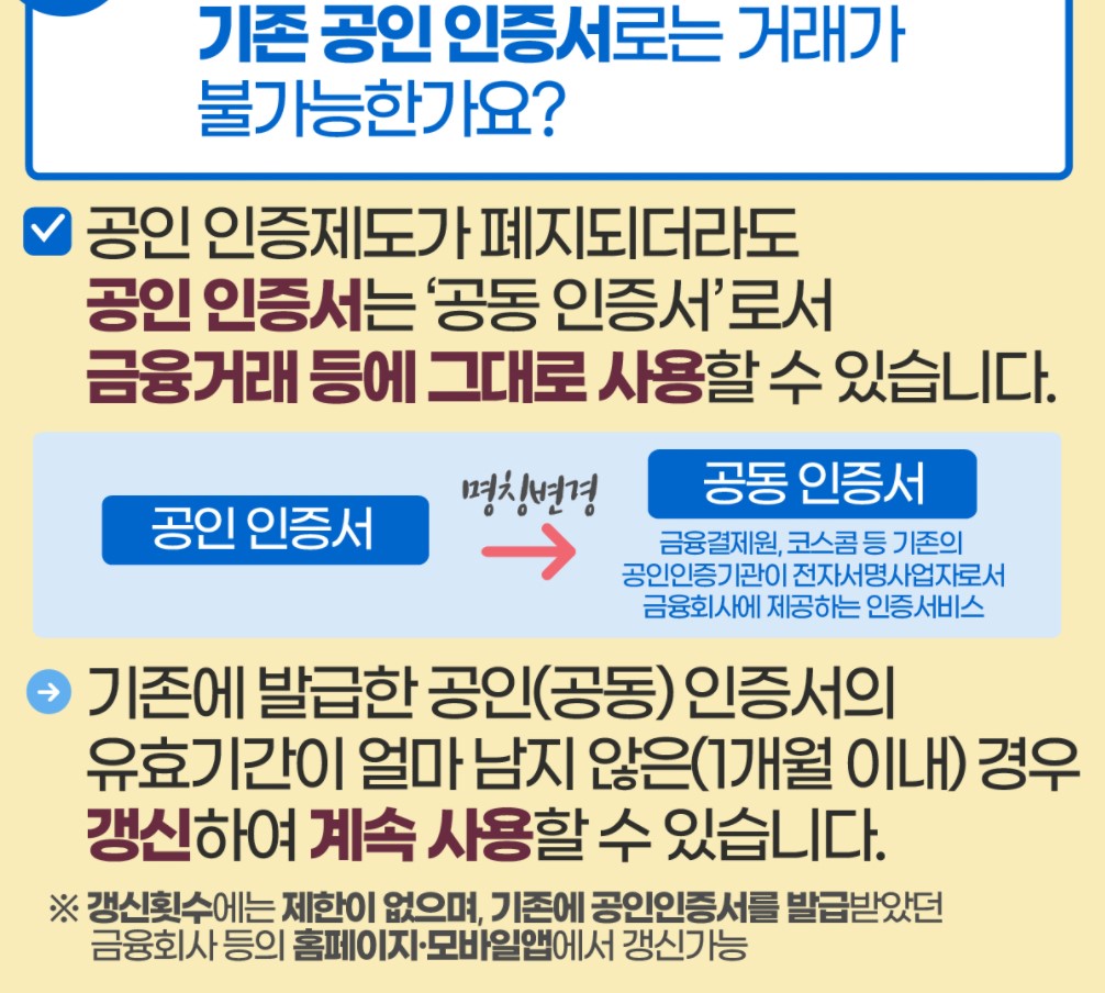 1) 기존 공인인증서를 이용한 사람들은 그대로 해당 인증서를 이용할 수 있고, 유효기간이 끝나도 해당 인증서를 계속 사용하고 싶다면, 공동인증서로 이름이 바뀐 인증서를 갱신해 사용하면 됩니다.