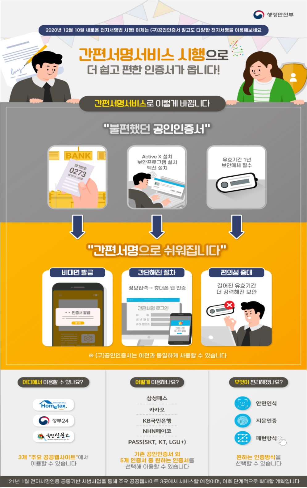 공인인증서가 폐지 됨에 따라, 은행에 방문하지 않아도 비대면으로 발급 가능한 편리함, 엑티브 엑스나 방화벽, 보안 프로그램 설치 불필요, 복잡한 비밀번호 없이 간편 비밀번호(PIN)나 안면·홍채·지문 등 생체 정보 패턴등으로 설정 가능해졌다고 합니다.