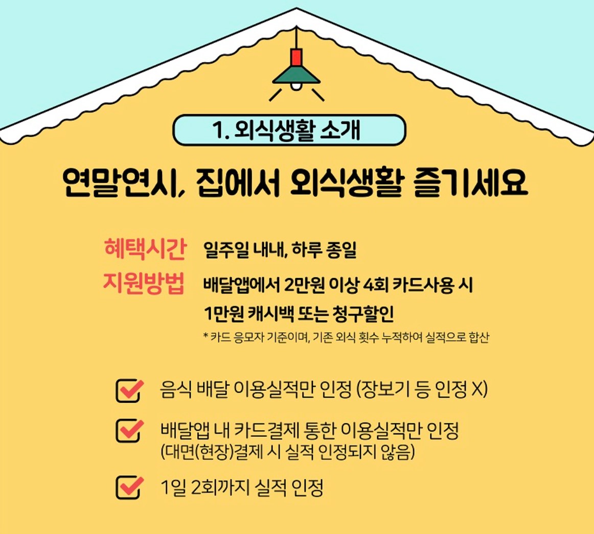 연말연시 집콕 외식생활~ 코로나19 안전하게 집에서 외식하세요! 기간 2020. 12. 29 (화) - 선착순 예산소진 시 까지 대상 KB국민카드 회원 (KB국민 기업, 비씨, 선불카드 제외) 내용 응모일부터 행사