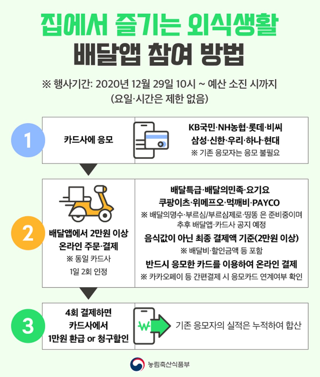농림축산식품부에서는 29일부터 외식 할인 지원을 재개한다고 발표하였습니다. 배달앱에서 2만원 이상 4번 주문·결제시 1만원을 환급해주는 이른바 외식쿠폰 지원입니다.
