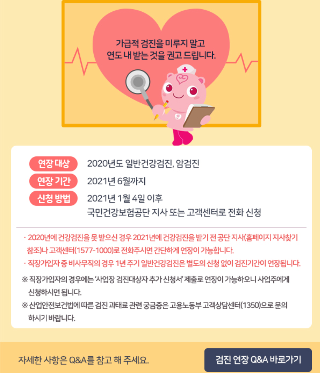 ③ 암검진 : 2020년 위암, 유방암, 자붕경부암, 폐암검진, 연장기간 내 암검진을 받더라도 기존 검진주기는 유지(2년주기면 다음 검진은 22년도)