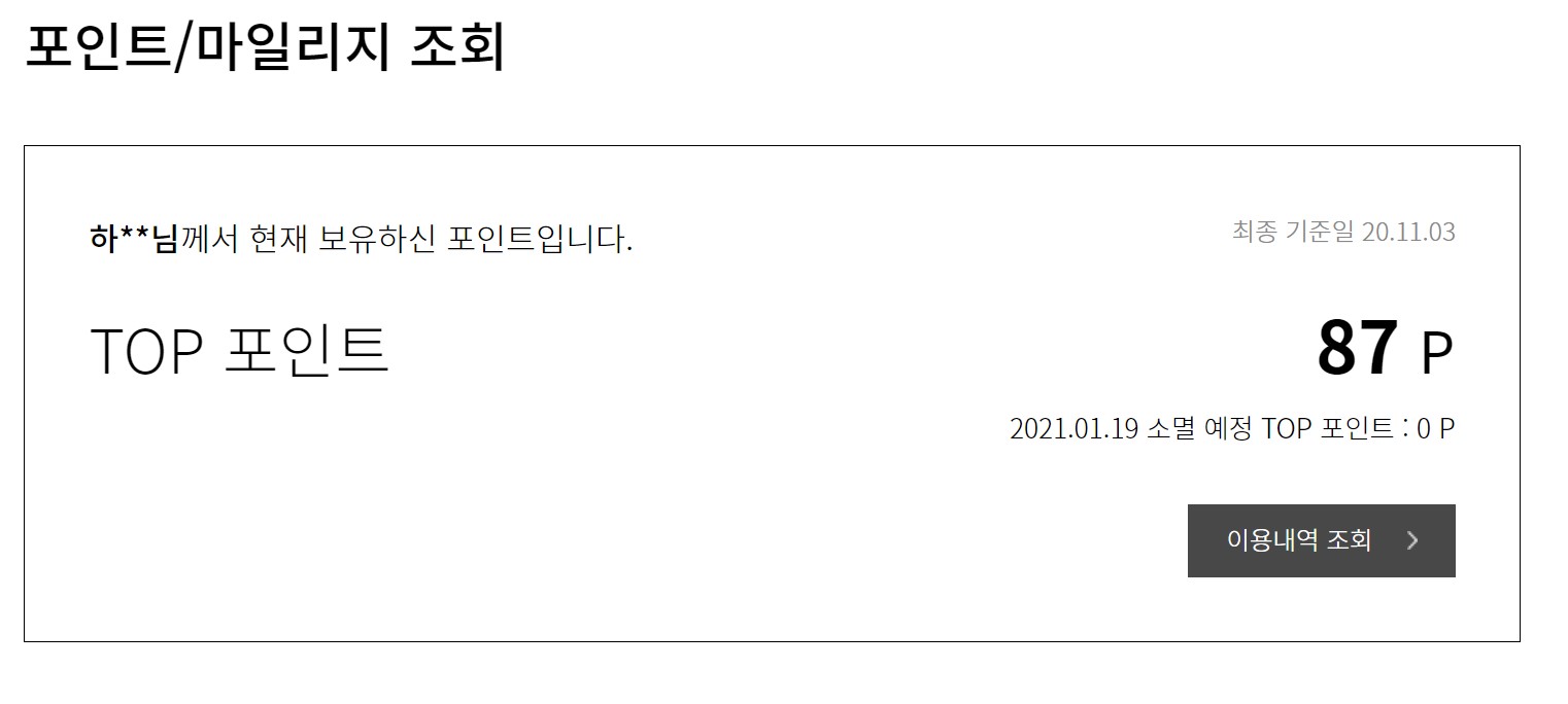TOP포인트의 유효기한은 포인트 적립월부터 5년(60개월)이며, 선입선출에 의해 적립월로부터 60개월이 경과한 포인트는 소멸된다고 합니다. 예를 들면 2021년 1월 적립포인트는 2026년 1월 1일에 소멸된다고 생각하시면 되겠습니다.
