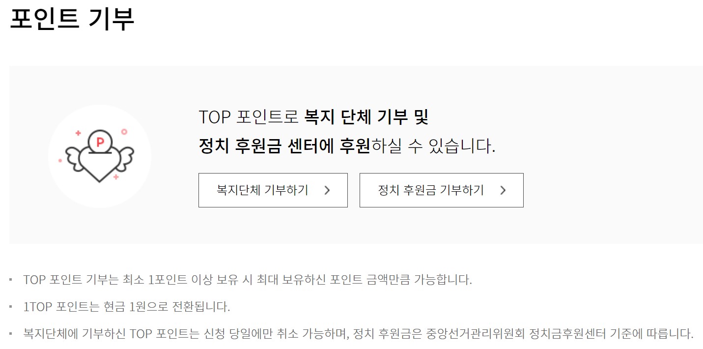 BC TOP포인트로 기부도 가능한 BC카드예요. 복지단체나 정치후원금 센터에 후원이 가능하다고 나와있어요. 1 TOP포인트 당 현금 1원으로 전환됩니다.