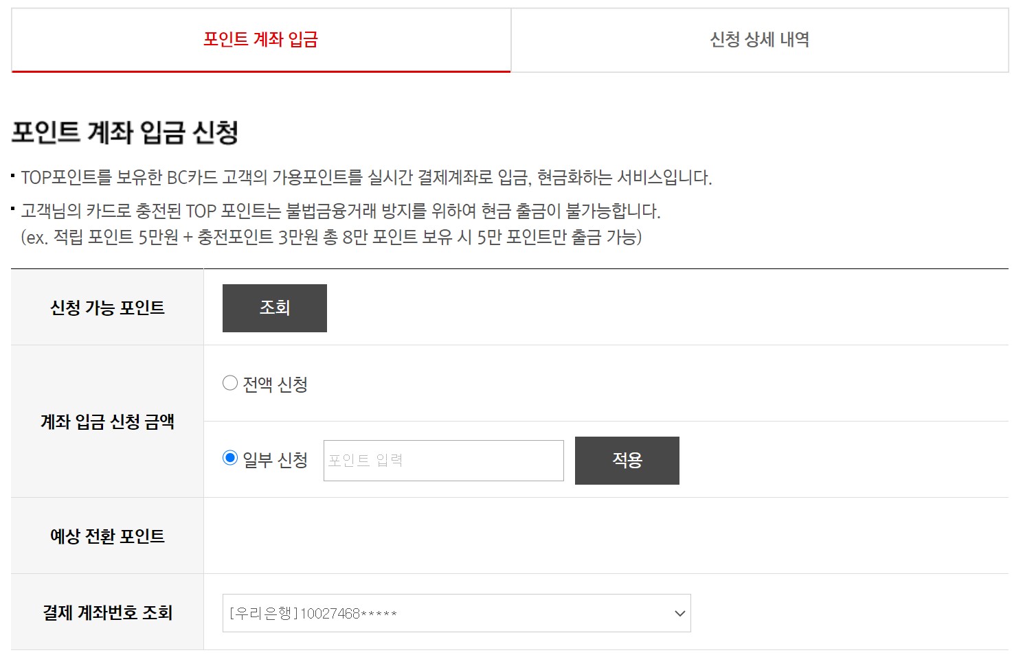 아마 많은 이용자들이 남은 포인트를 현금화 시키는 방법을 많이 택할 것 같은데요. 이는 남은 포인트를 내가 원하는 계좌로 입금을 받는 방법이예요. 단! 불법금융거래 방지를 위해 카드로 충전된 TOP포인트는 현금 출금이 불가능 하다고 하니 참고하시면 되겠습니다.