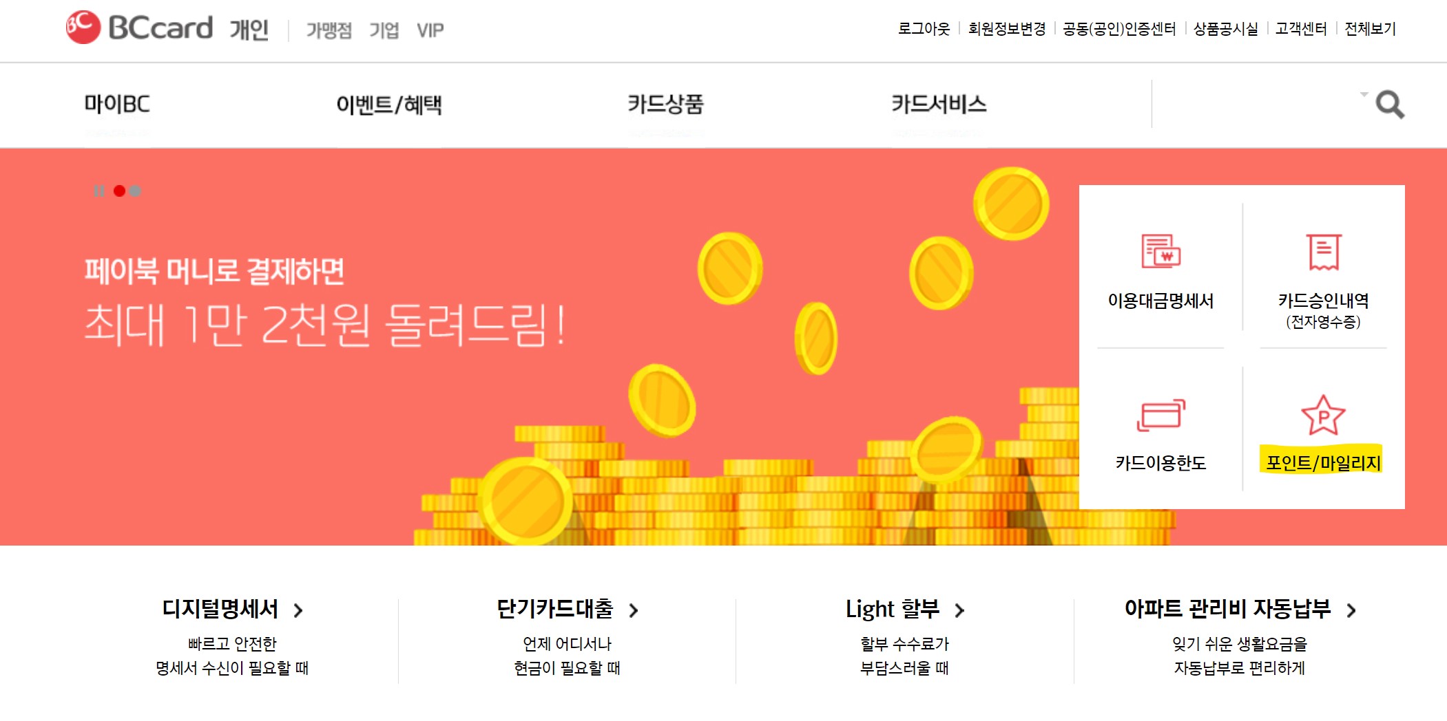 1. 우선 BC카드 TOP포인트를 조회하려면 BC카드 홈페이지에 들어가 로그인을 한 뒤 우측 하단에 보시면 포인트/마일리지가 있는데 이것을 클릭해주세요. 로그인을 하려면 공인인증서로 로그인 해줘야합니다. 기존에 가입해놓은 아이디, 비밀번호가 있다면 그걸로 로그인해도 되지만, 저는 자주 까먹기 때문에 공인인증서로 로그인하는게 편해졌어요.