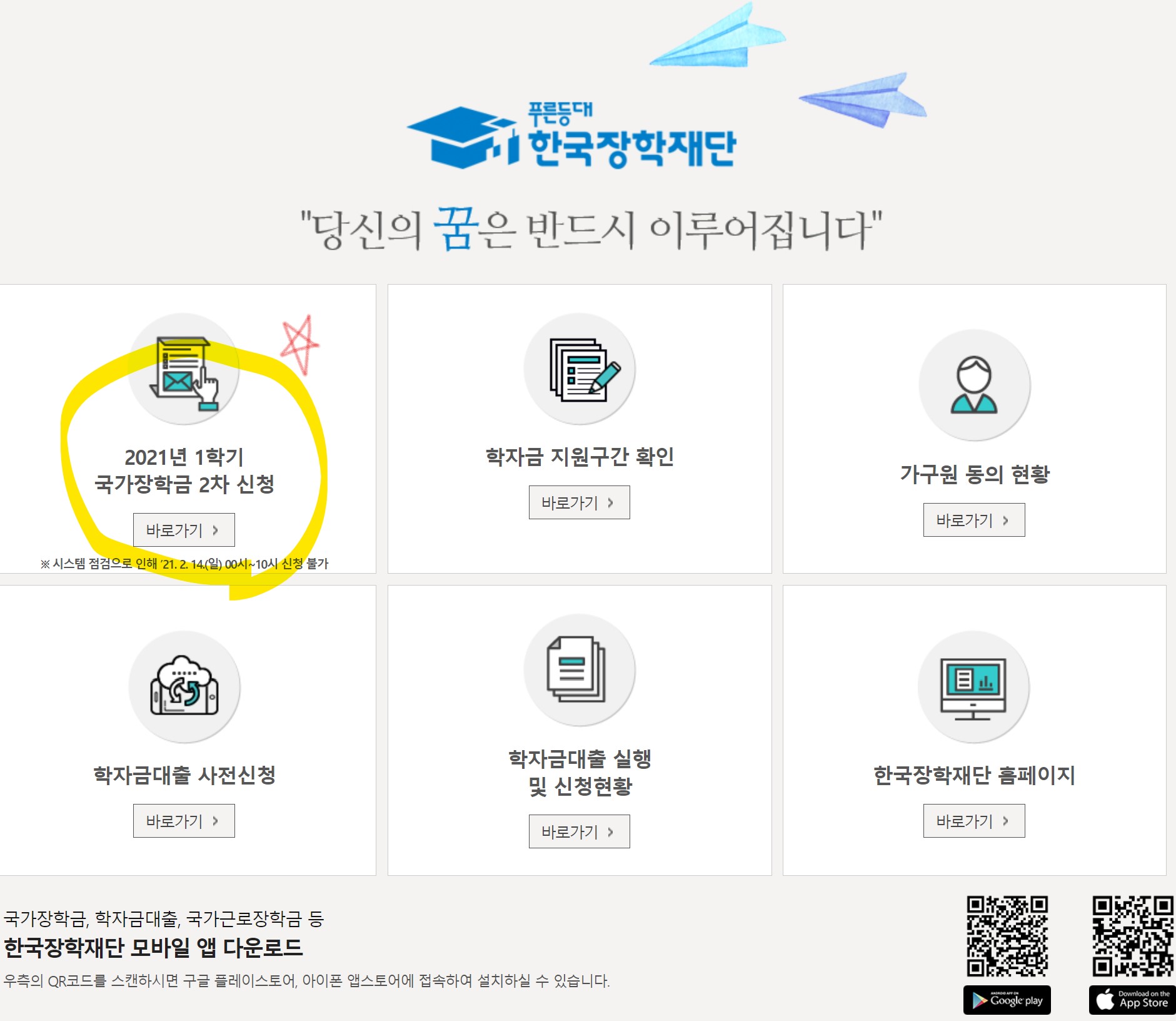 국가장학금 2차 신청방법 : 한국장학재단 홈페이지(www.kosaf.go.kr/) 또는 한국장학재단 앱