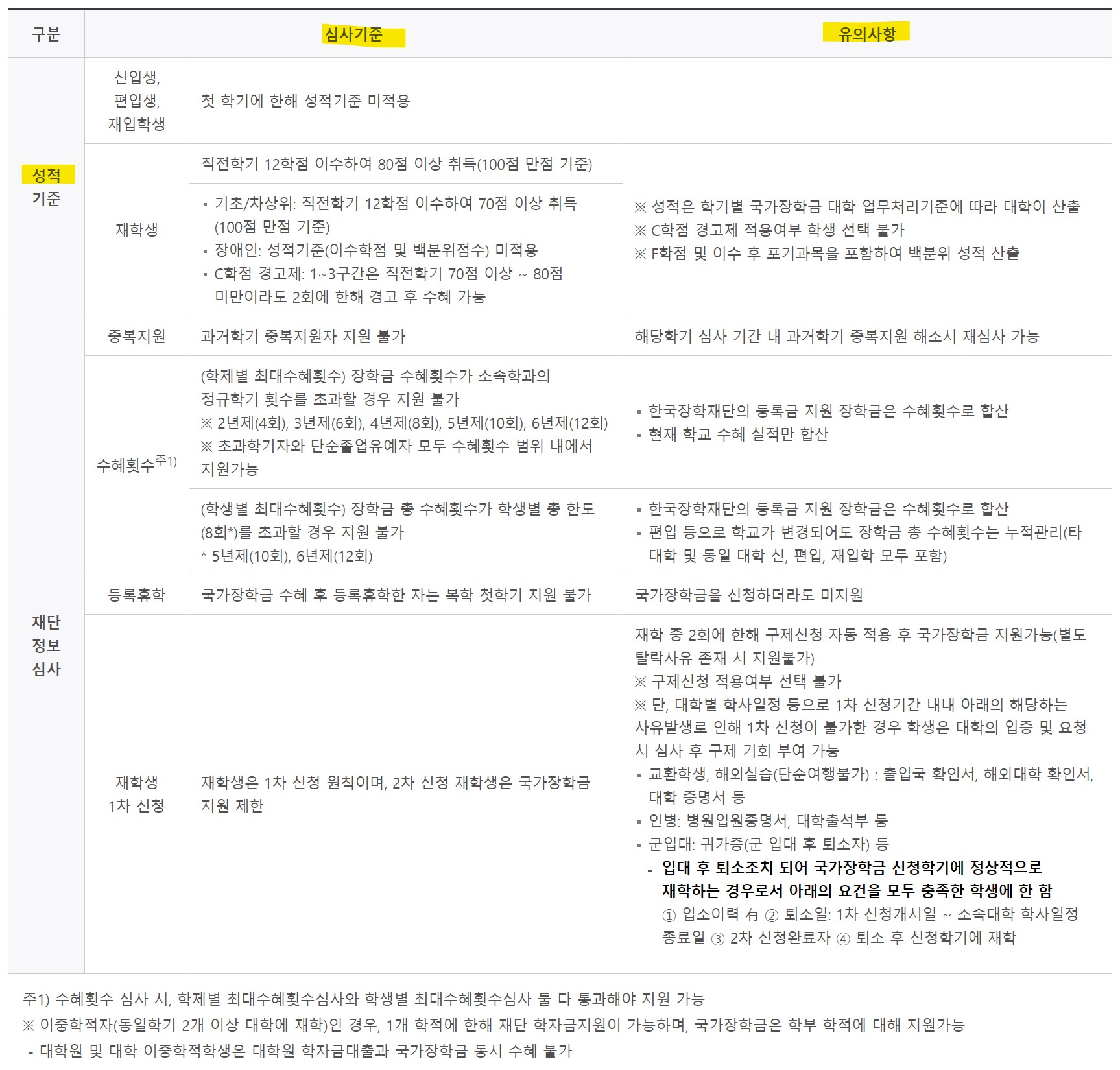 * 신입생/편입생/재입학생은 첫 학기에 한해 성적 기준이 적용되지 않습니다.