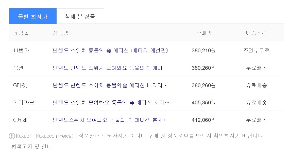현재 인터넷에 검색해 본 닌텐도 스위치 동물의 숲 에디션 몰별 최저가 현황이에요. 정가인 36만원보다 2만원이나 비싸네요. 이마저도 들어가보면 재고가 없을 수도 있다는 사실. 저는 운좋게 잘 구매했네요!!