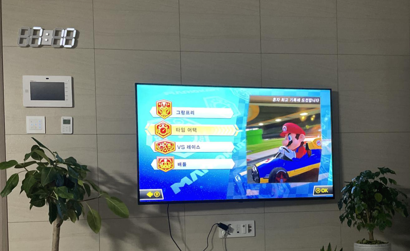 집 TV랑 연결해서 마리오 카트를 해봤어요. 작은 화면보다 TV랑 연결해서 게임을 하니 몰입도가 더 높고 재밌었답니다! 마리오 카트는 최대 4P까지 가능한 것 같았어요. 조이스틱만 2개 더 구매해서 나중에 손님들이 방문했을 때 함께 하면 정말 재밌겠더라고요.
