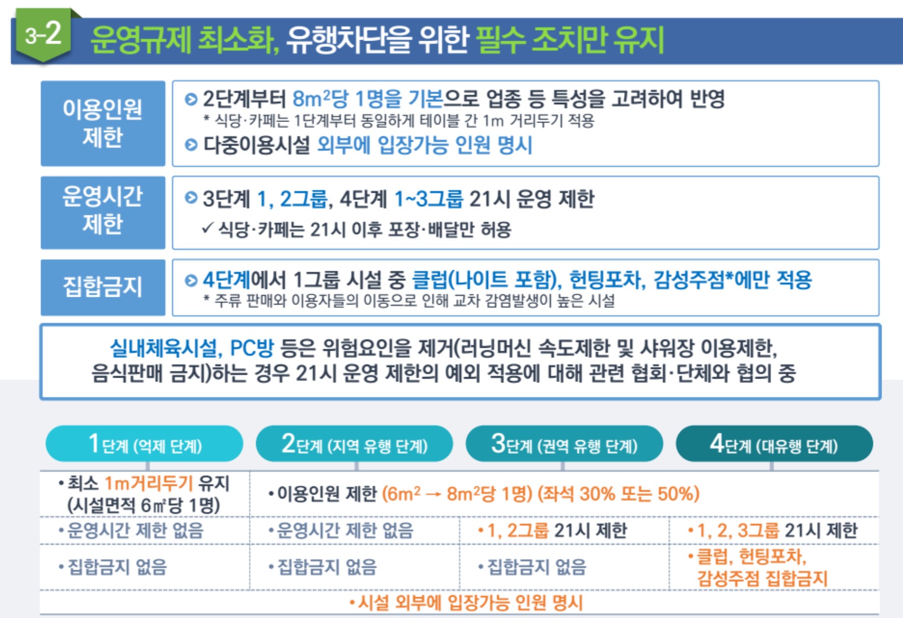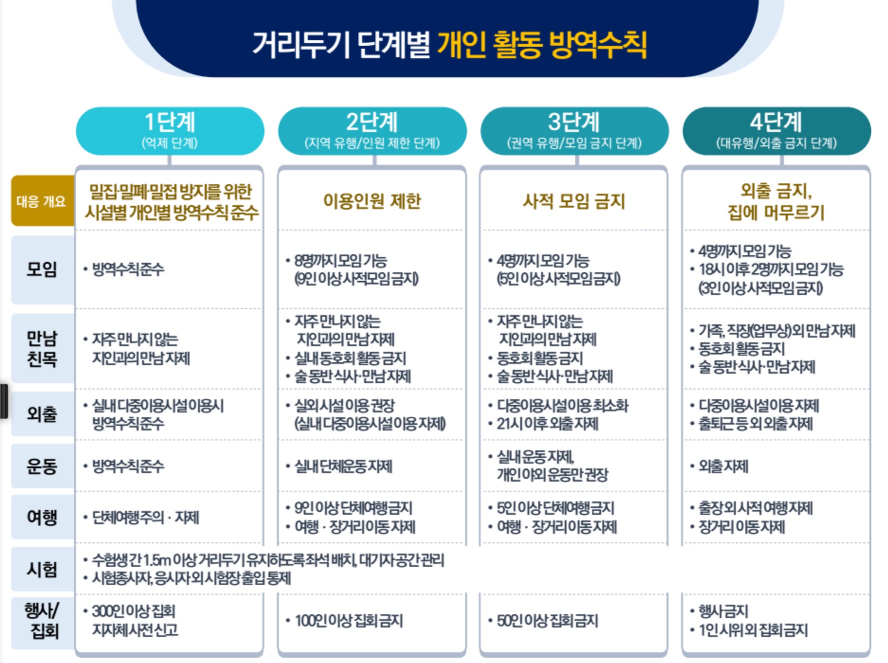 - 4단계 : 4명까지 모임 가능, 18시 이후 2명까지 모임 가능(3인이상 사적 모임 금지)