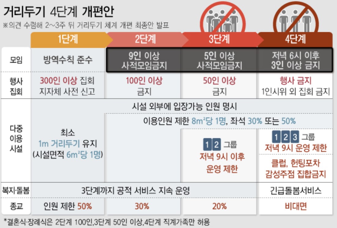 사회적 거리두기 개편안 4단계, 모임 3~9인 금지