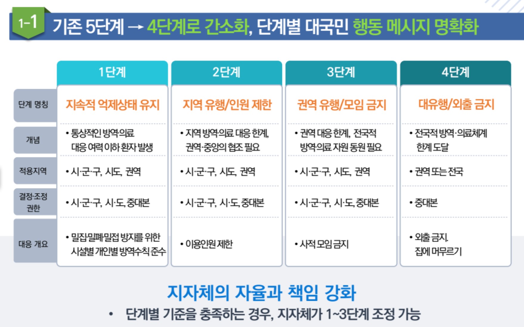 정부가 새롭게 사회적 거리두기 개편안을 마련했습니다. 이는 현행 5단계에서 4단계로 간소화 하였으며, 단계별 국민들이 어떻게 행동을 해야 하는지에 대해 사회적 거리두기 개편안 4단계를 마련했는데요.