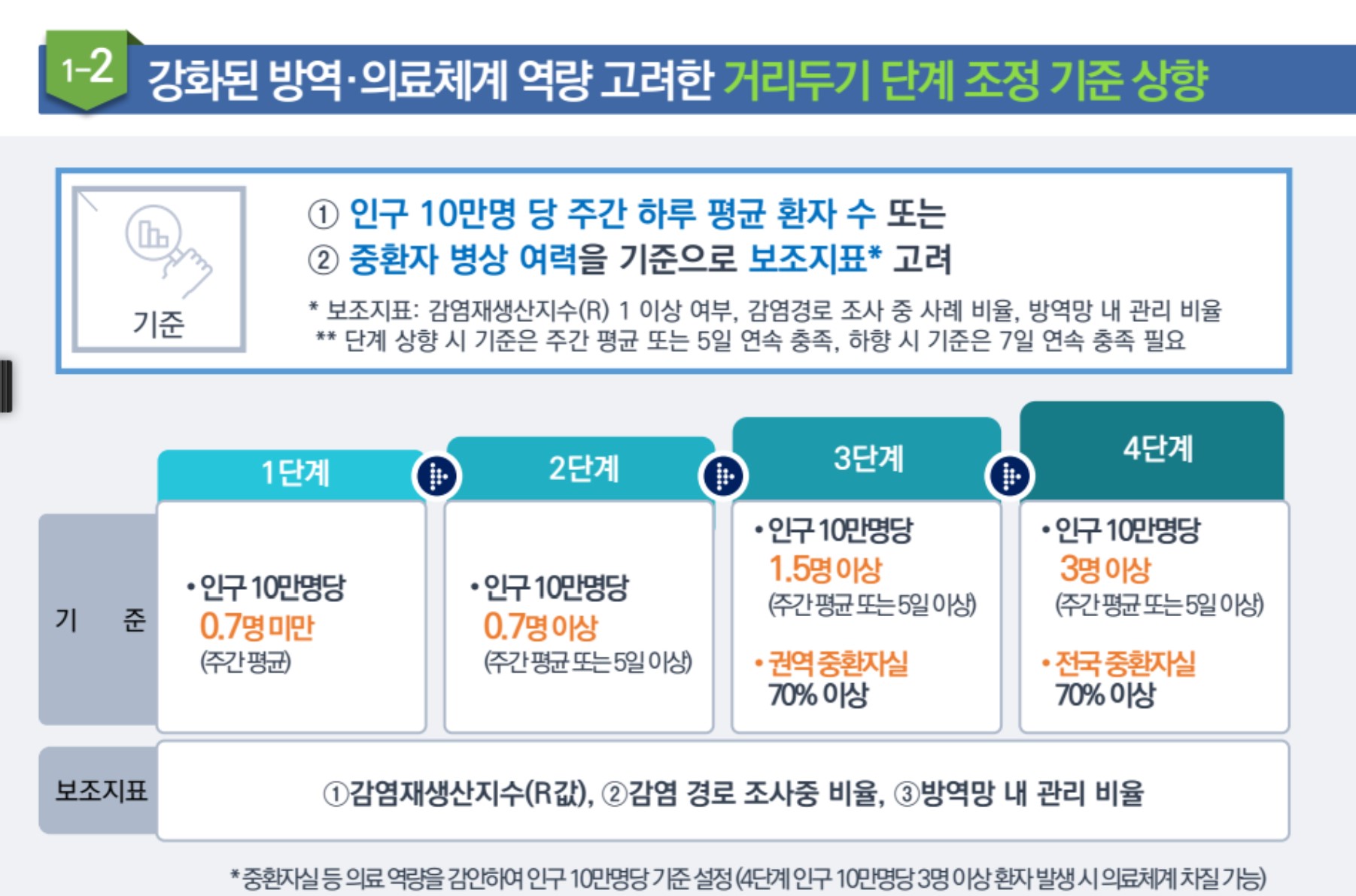 사회적 거리두기 단계는 해당지역의 인구 10만명당 확진자 수로 1~4단계를 결정합니다.