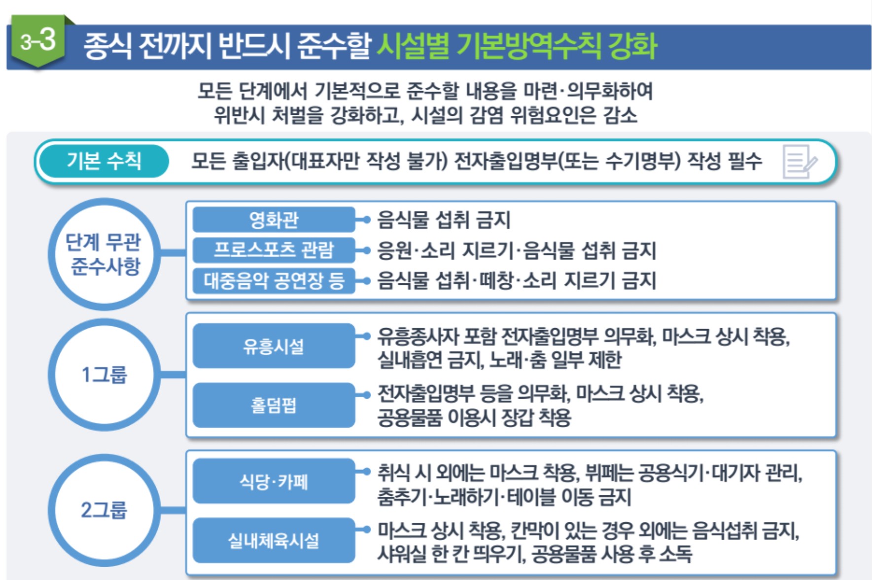 - 3그룹 : 영화관·공연장, 학원, 결혼식장, 장례식장, 이미용업, 오락실·멀티방, 독서실·스터디카페, 놀이공원·워터파크, 상점·마트·백화점