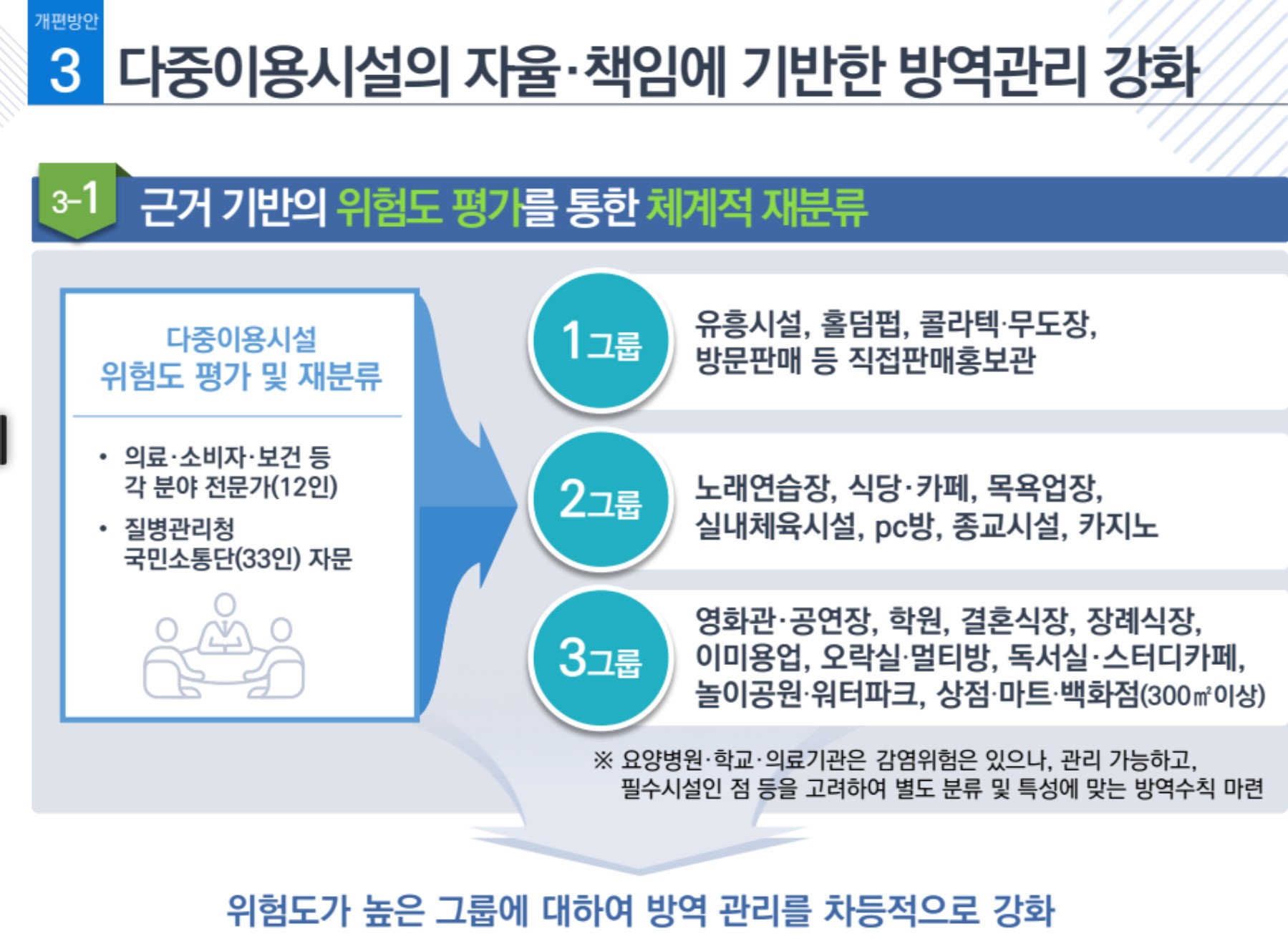 다중이용시설은 위험도에 따라 3개 그룹으로 나누어 그룹별 방역조치가 단계에 따라 차등 적용이 됩니다.