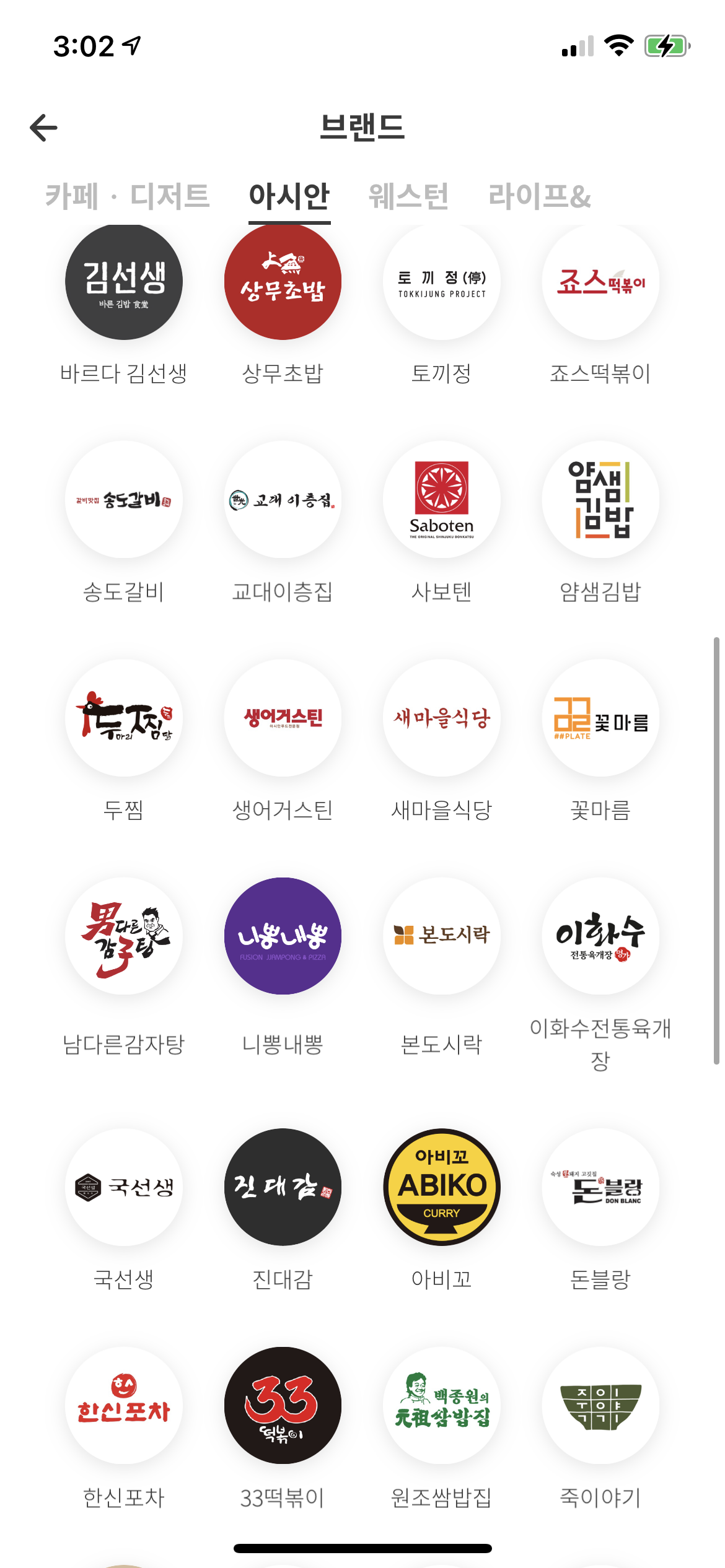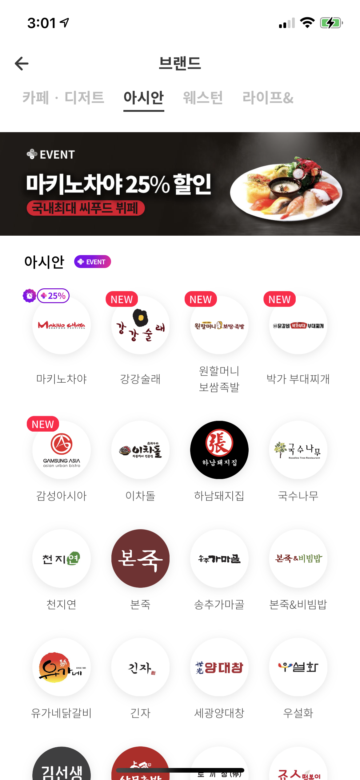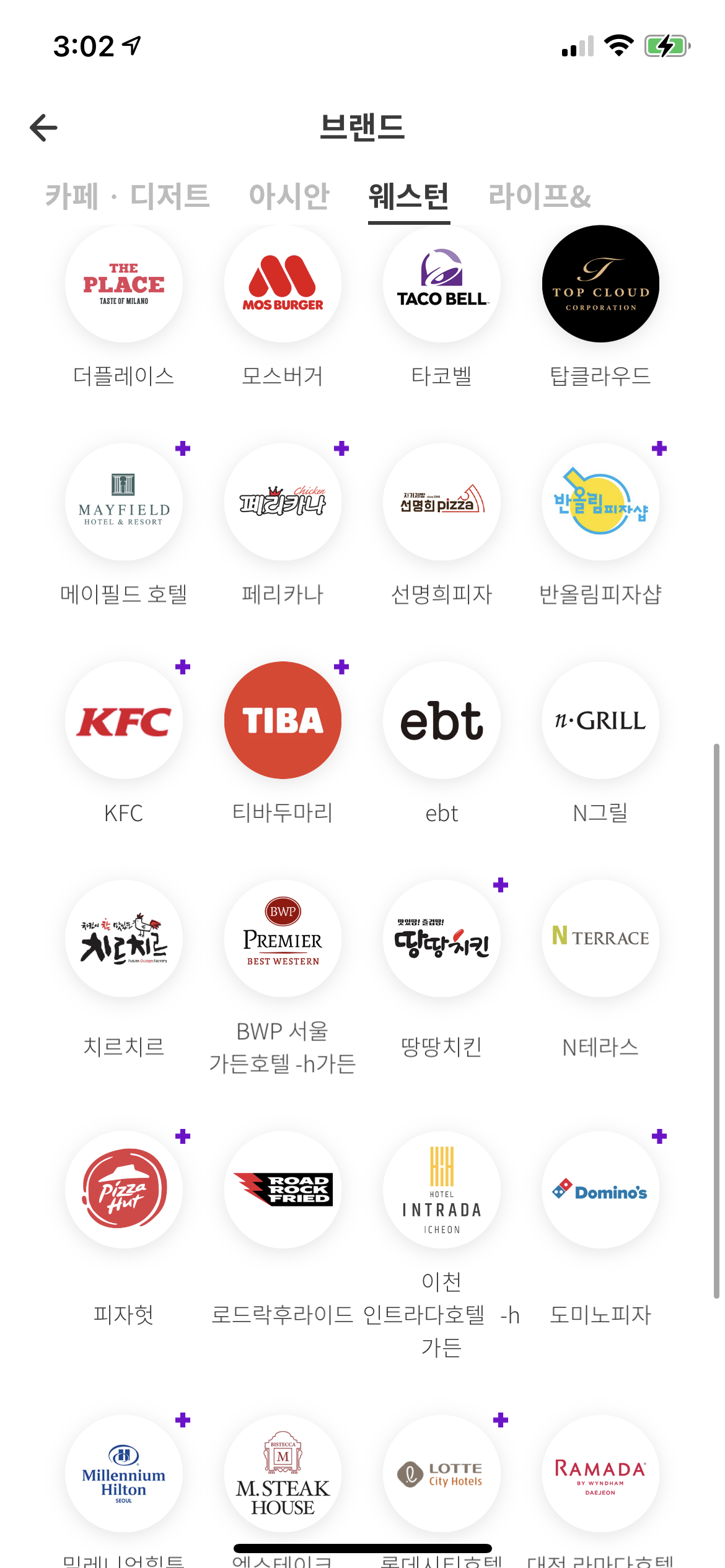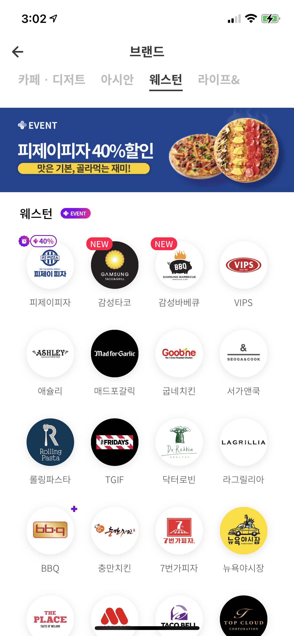 외식 : VIPS, 애슐리, 매드포갈릭, 굽네치킨, 미스터피자, 피자헛, KFC, 본죽, 유가네, 콩불, 바르다김선생, 얌샘김밥, 본도시락, 죠스떡볶이 등