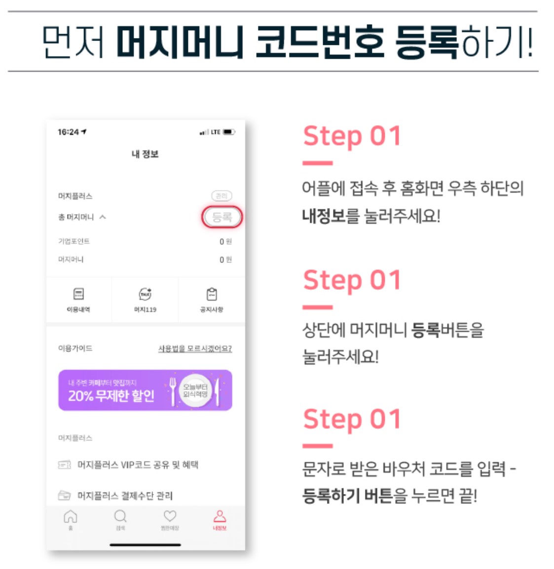 <머지머니 등록방법> : 머지포인트 어플 - 내정보 - 머지머니 등록 - 구매한 바우처코드 입력 후 등록