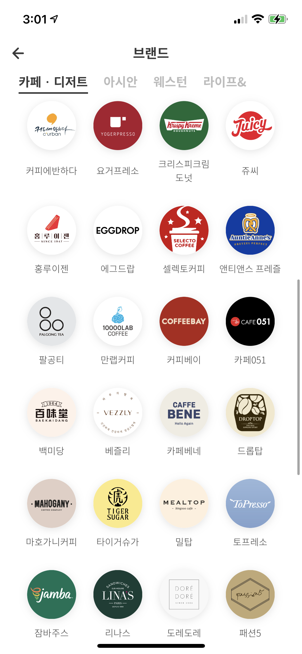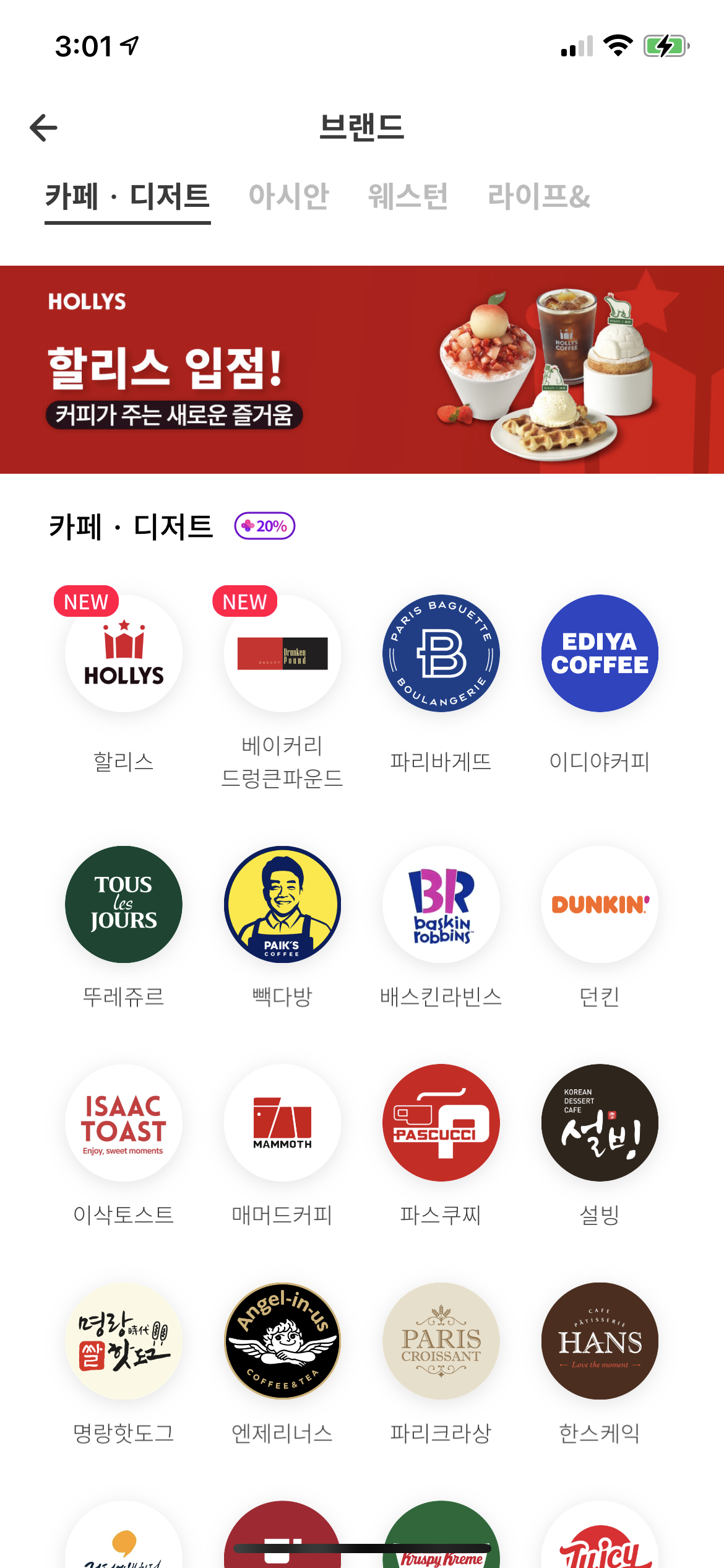 디저트, 카페 : 파리바게트, 던킨, 이디야, 엔젤리너스, 크리스피크림, 탐앤탐스, 설빙, 빽다방, 배스킨라빈스, 뚜레주르, 홍루이젠 등