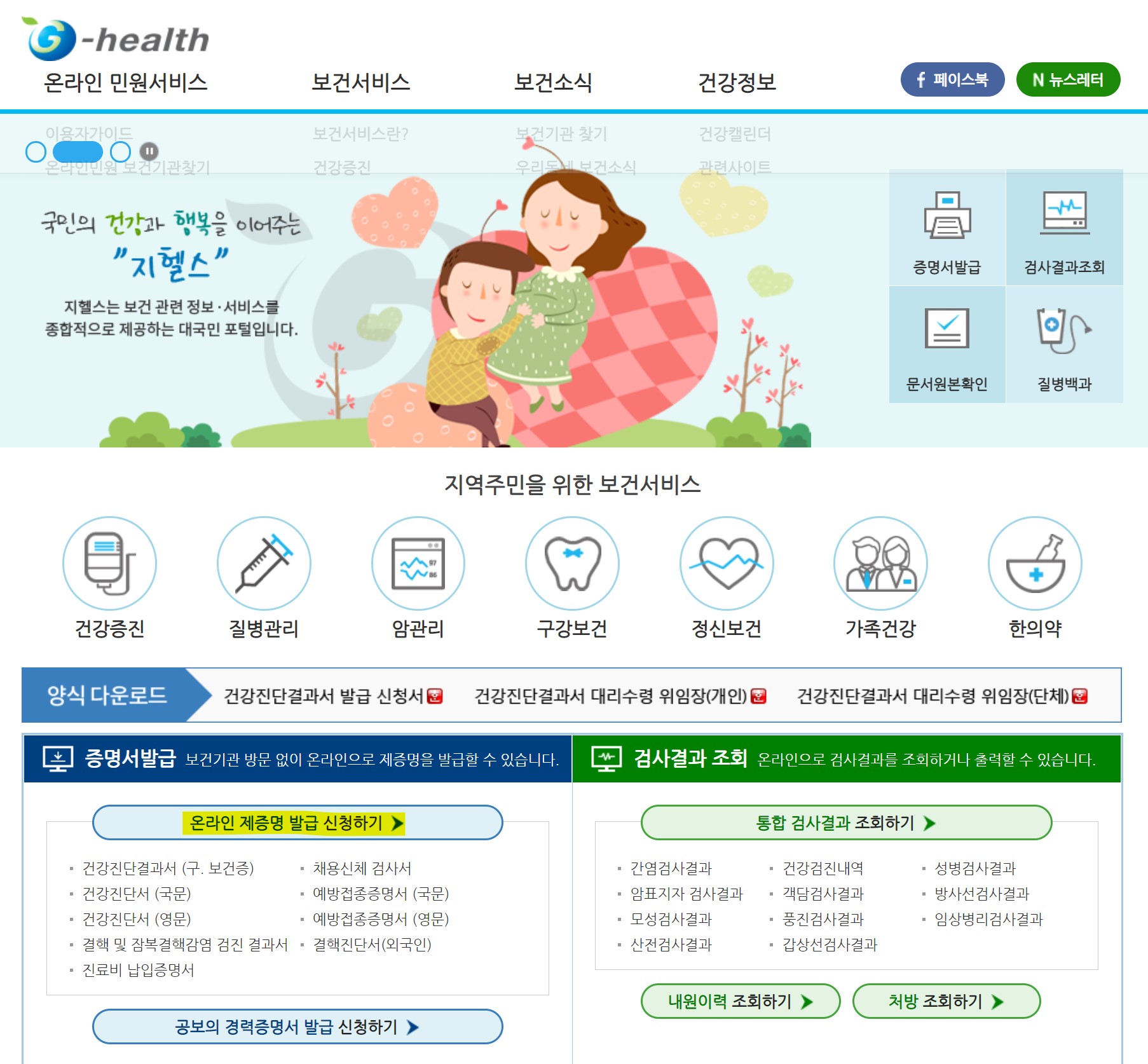 1. 위의 공공보건포털 사이트에 접속하여 홈페이지 중앙에 '온라인 제증명 발급 신청하기' 를 클릭합니다.