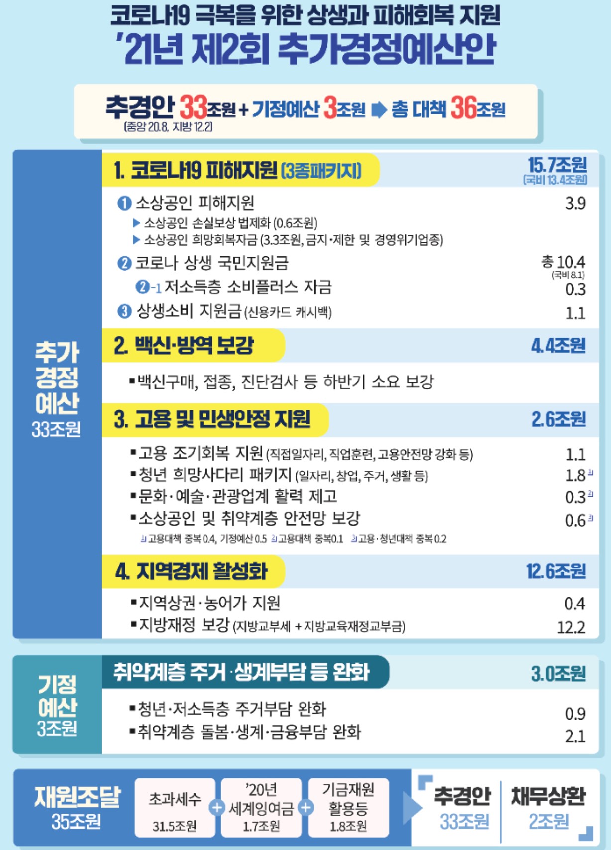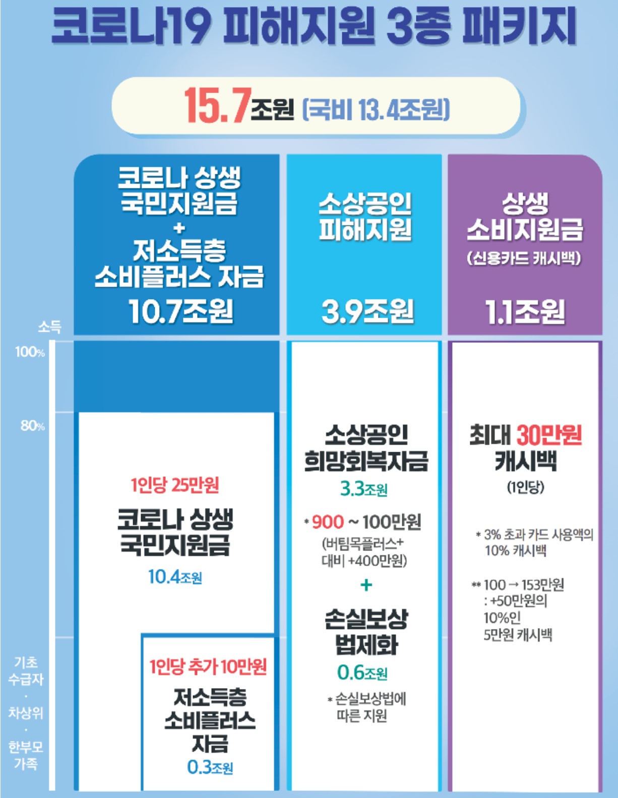이번 코로나 피해지원 3종 패키지(재난지원금/소상공인 지원/카드 캐시백)로 무려 15.7조 원이 쓰일 예정입니다.