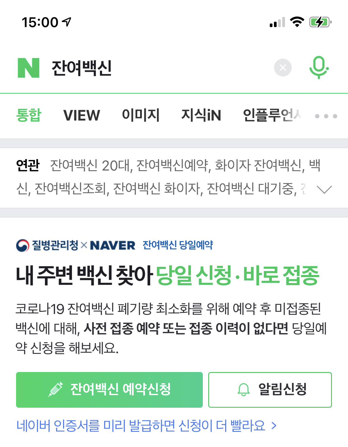 네이버 어플을 실행한 뒤 잔여백신이라고 검색을 해줍니다.