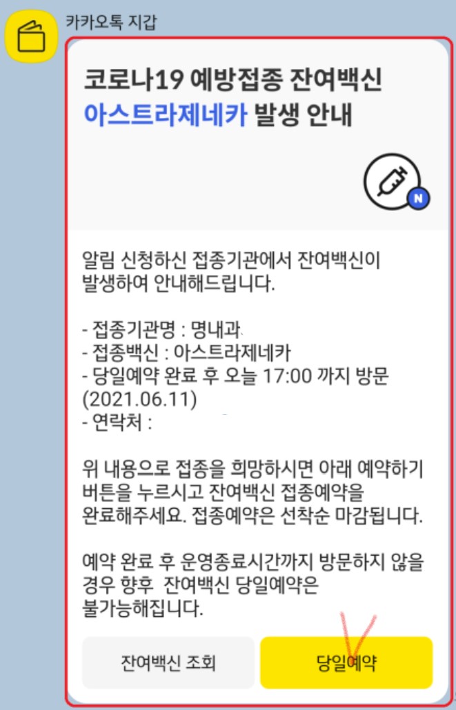 이후 알림 설정한 의료기관에 잔여백신이 나오면 카카오톡 지갑으로 아래와 같이 안내 카톡이 옵니다.