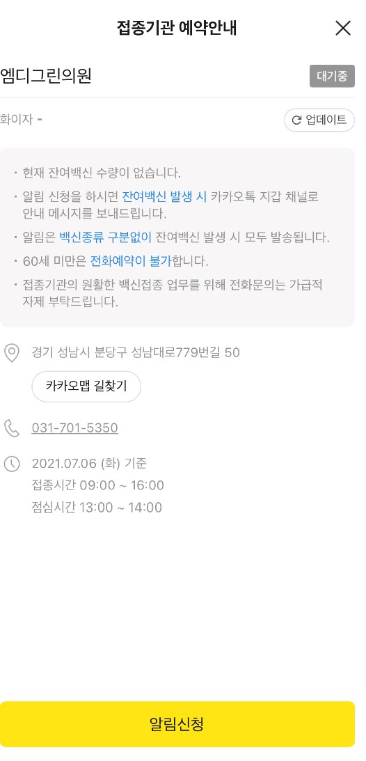 3. 잔여백신 기관 선택, 알림신청 완료