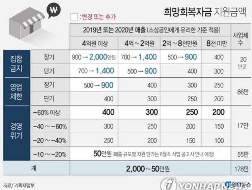 코로나 피해 소상공인 대상으로 지급하는 희망회복 자금은 최고 900만 원에서 2,000만 원으로 2배 이상 상향되었습니다.