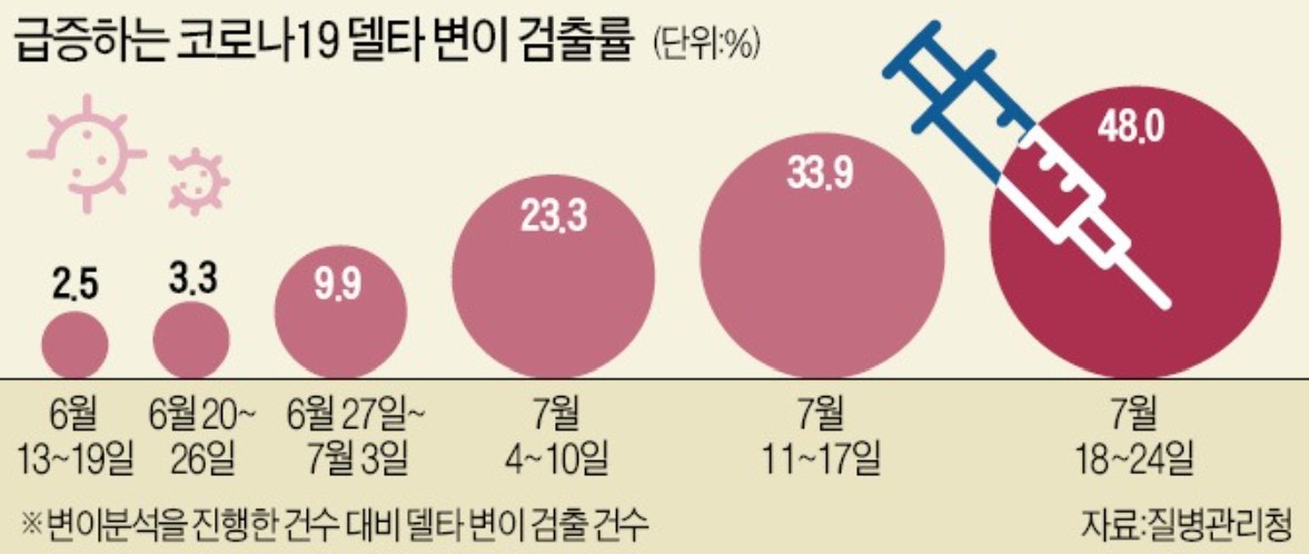 델타변이 바이러스는 전파력이 훨씬 강해 현재 신규 확진자 절반 이상이 델타변이 바이러스에 감염이 되고 있는 실정입니다.