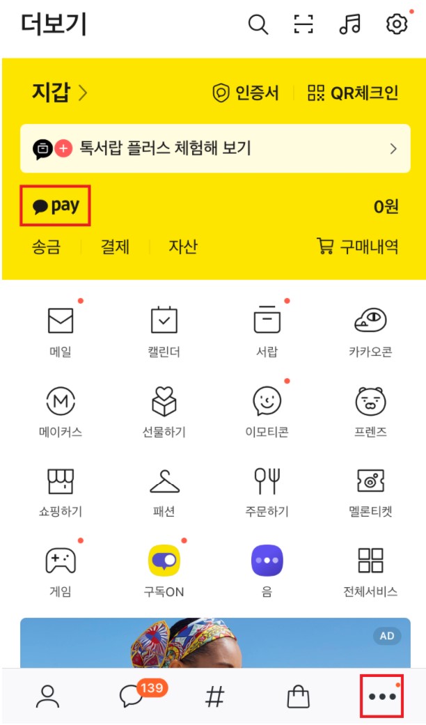 1. 카카오톡을 실행 → 아래 채팅창 오른쪽 점 세개를 클릭 → pay 빨간박스를 터치합니다.