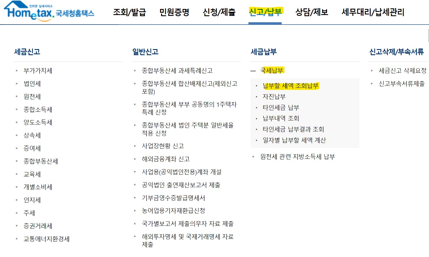 1. 국세청 홈택스 접속 > 로그인 > 신고/납부 - 국세 납부 - 납부할 세액 조회 납부 클릭