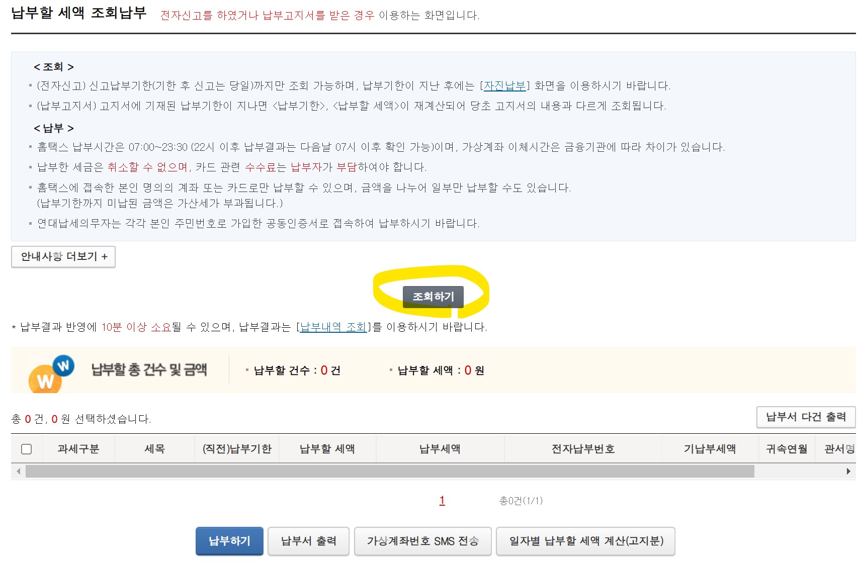 조회하기 버튼을 클릭 후 종부세 확인을 하면 되고, 종부세 납부 대상이라면 하단에 납부할 총 건수 및 금액이 나타납니다.