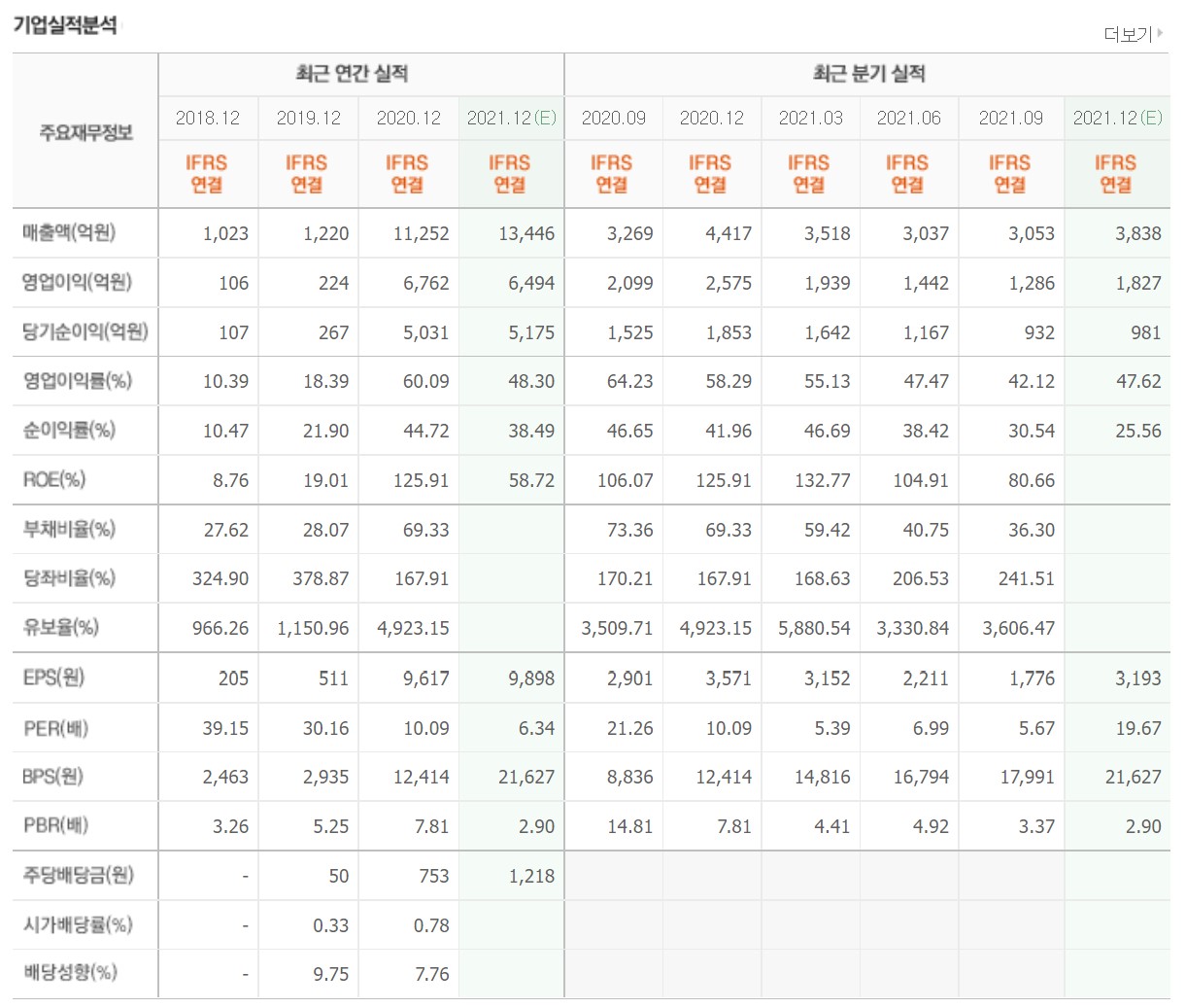 2021년 9월 전년 동기 기준 매출액은 61% 증가 영업이익 56%증가 당기순이익 57% 증가한 바 있고