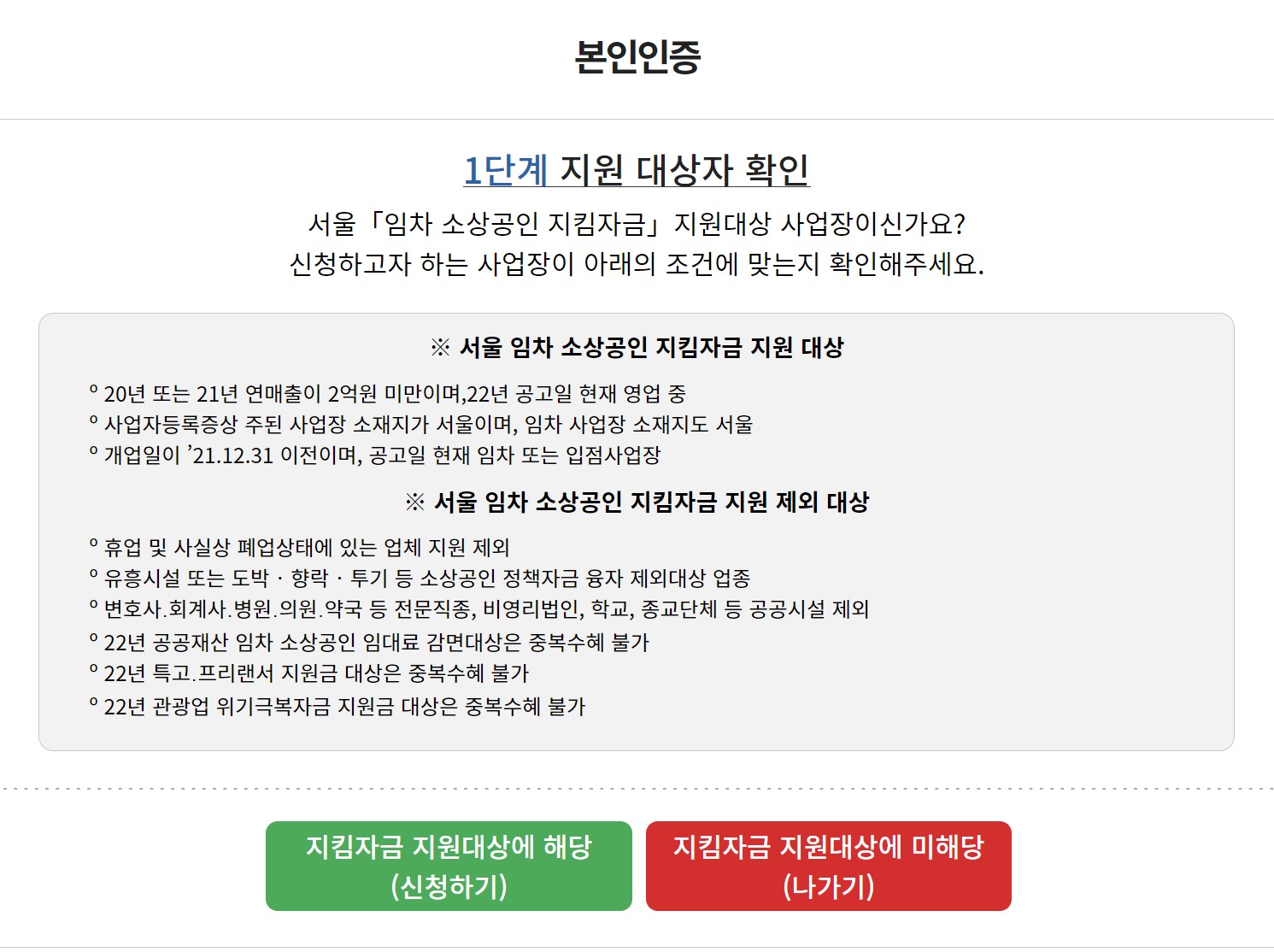 서울 임차 소상공인 지킴자금 지원대상이 맞는지 확인하는 절차입니다.