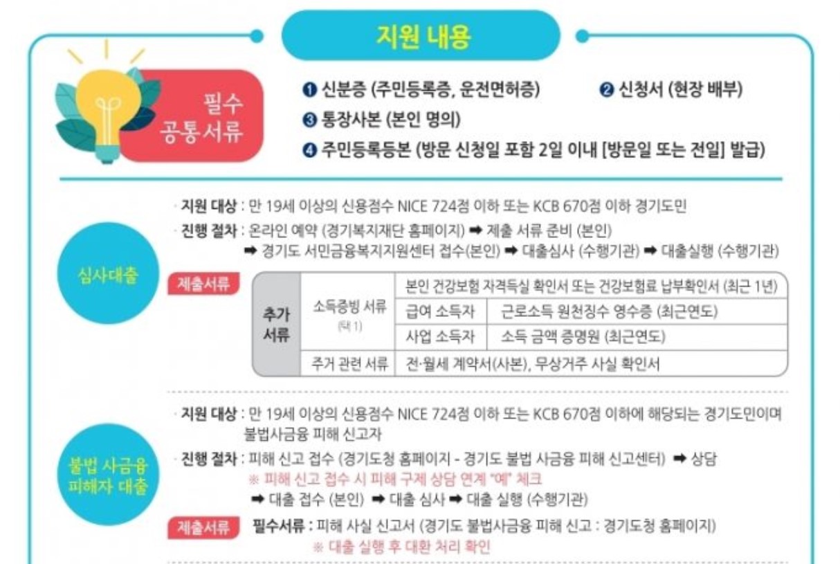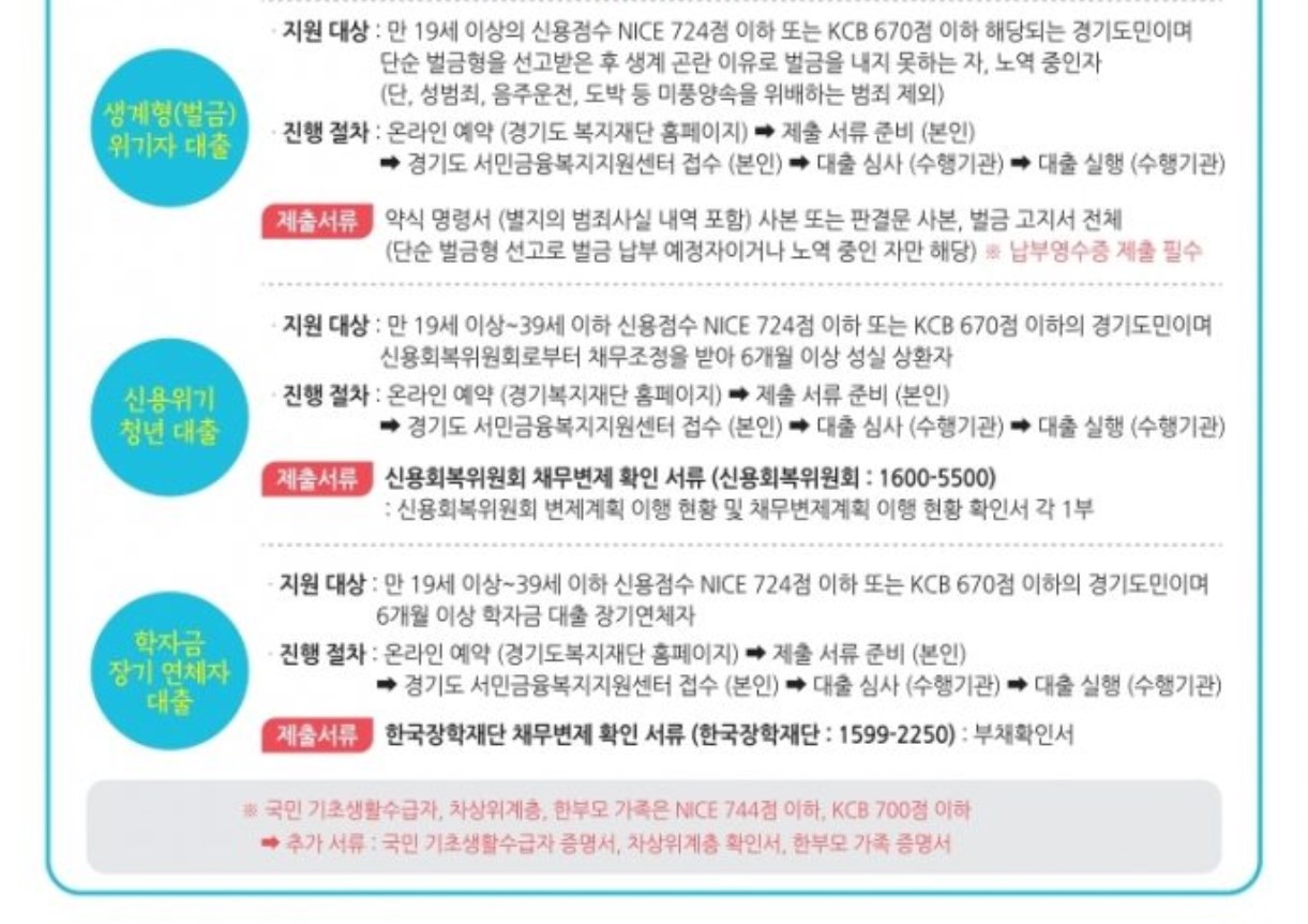 신용점수 NICE 724점, KCB 670점 이하, 경기도 주소지 요건만 충족되면 신청 가능합니다.