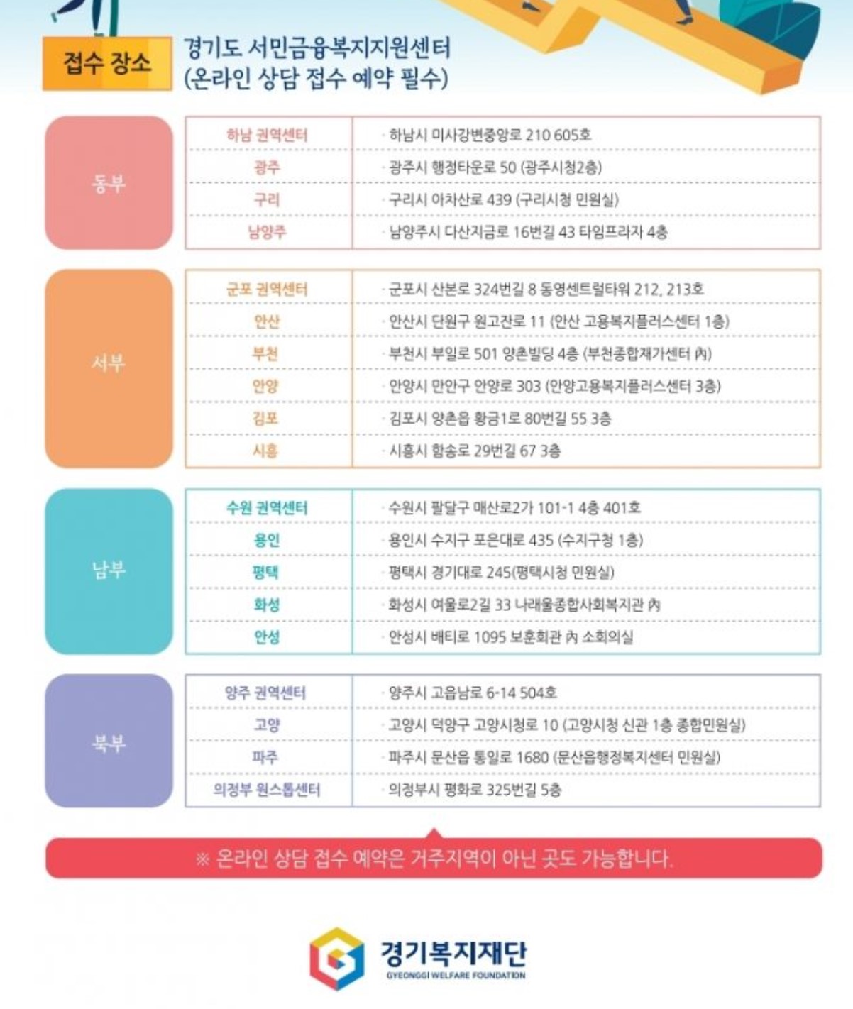 경기복지재단 홈페이지에서 사전 상담 접수 예약 후 필요서류를 지참하여 경기도 서민금융복지지원센터에 본인이 직접 방문신청을 하셔야 합니다. ★온라인 사전 상담 접수 예약이 필수이기 때문에 예약 없이 방문하면 신청이 어려우니 꼭 예약을 하고 방문하시기 바랍니다.