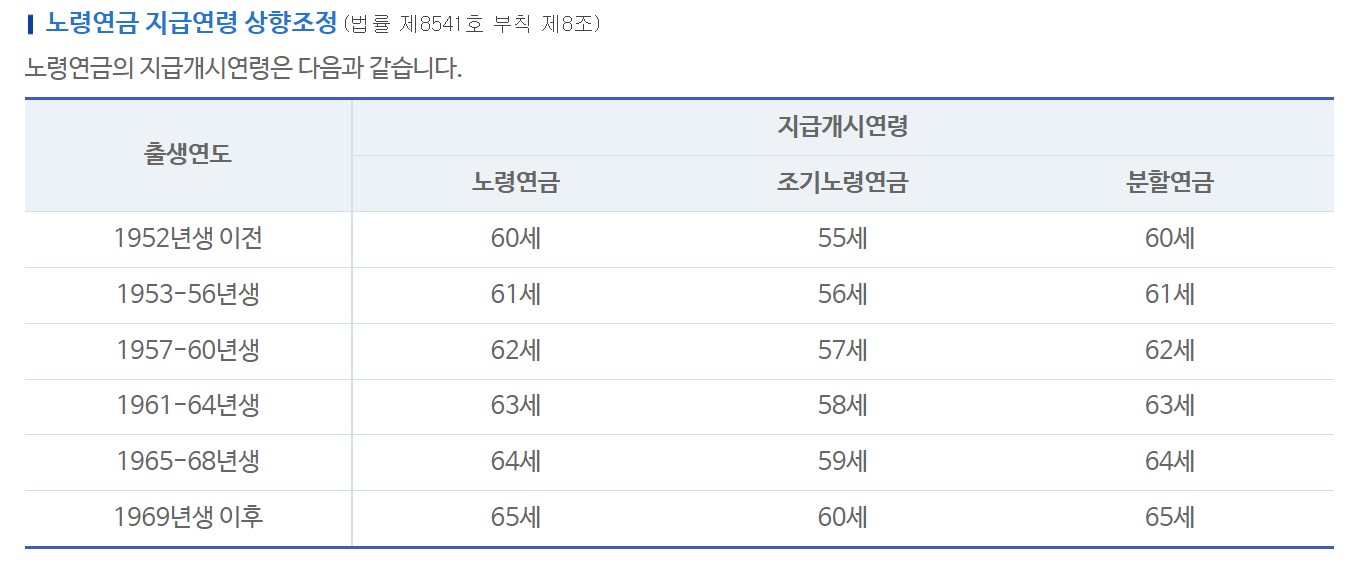 아래표와 같이 예를 들어 1969년 이후 출생하신 분들은 노령연금 수령나이는 65세부터 가능하며, 조기노령연금은 60세부터 신청이 가능합니다.