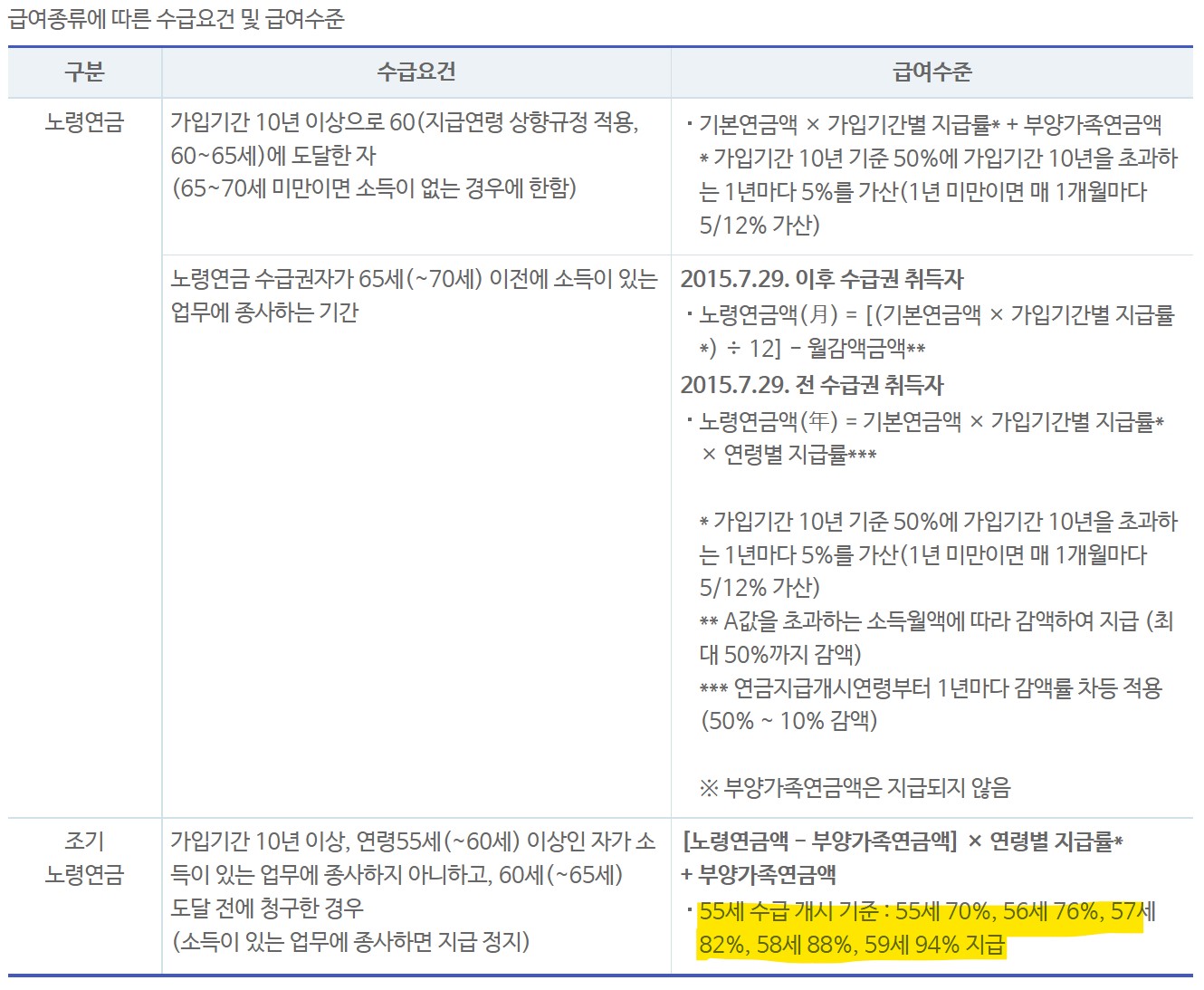 조기노령연금은 국민연금 가입기간이 10년 이상이고 55세 이상인 사람이 소득이 없을 때, 60세 이전이라도 지급받을 수 있는 연금입니다. 조기노령연금을 수령하려고 할 때, 가입기간과 처음 연금을 지급받는 연령에 따라 일정률*의 기본연금액에 부양가족연금액을 합산해 지급받게 됩니다.