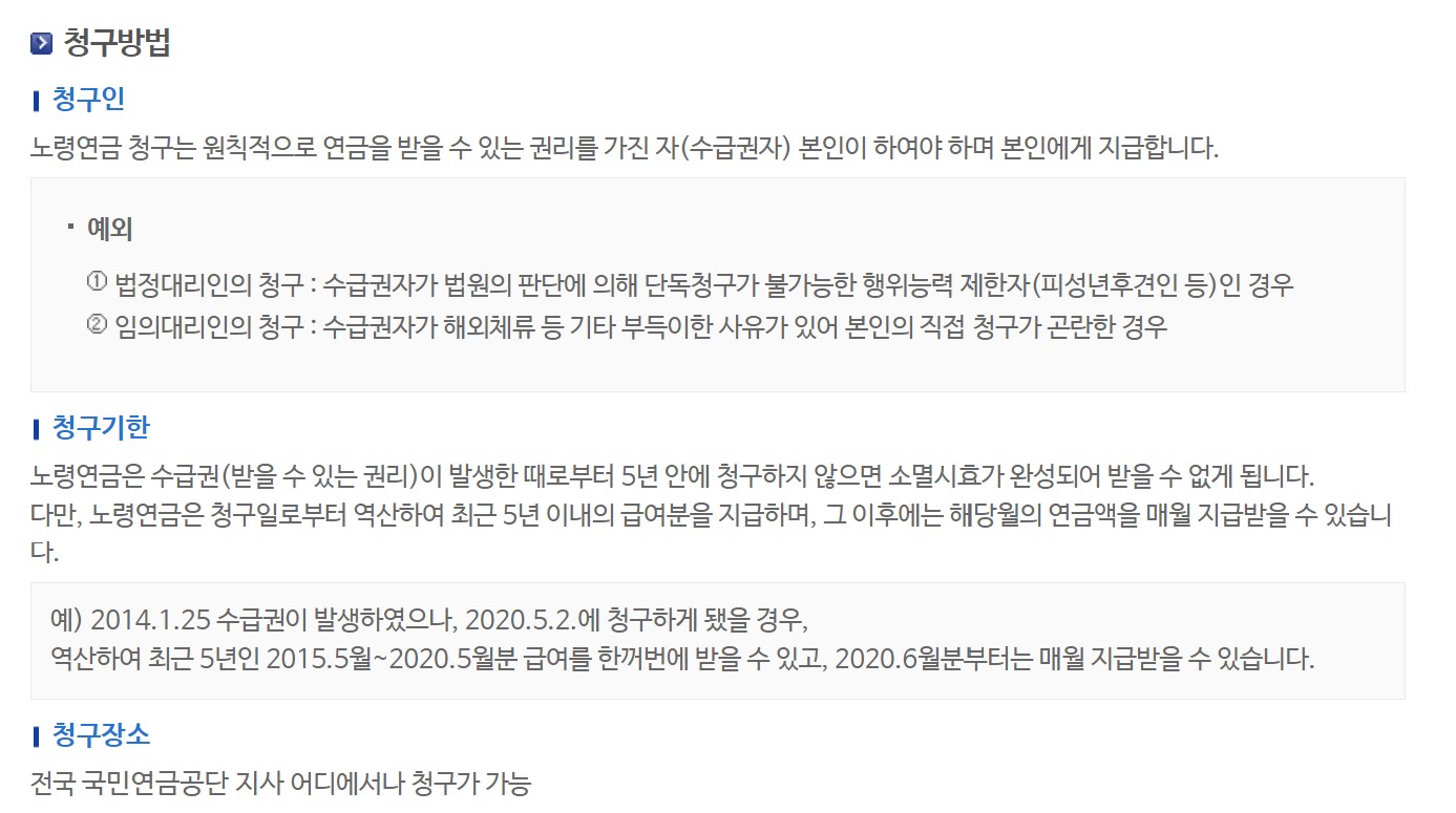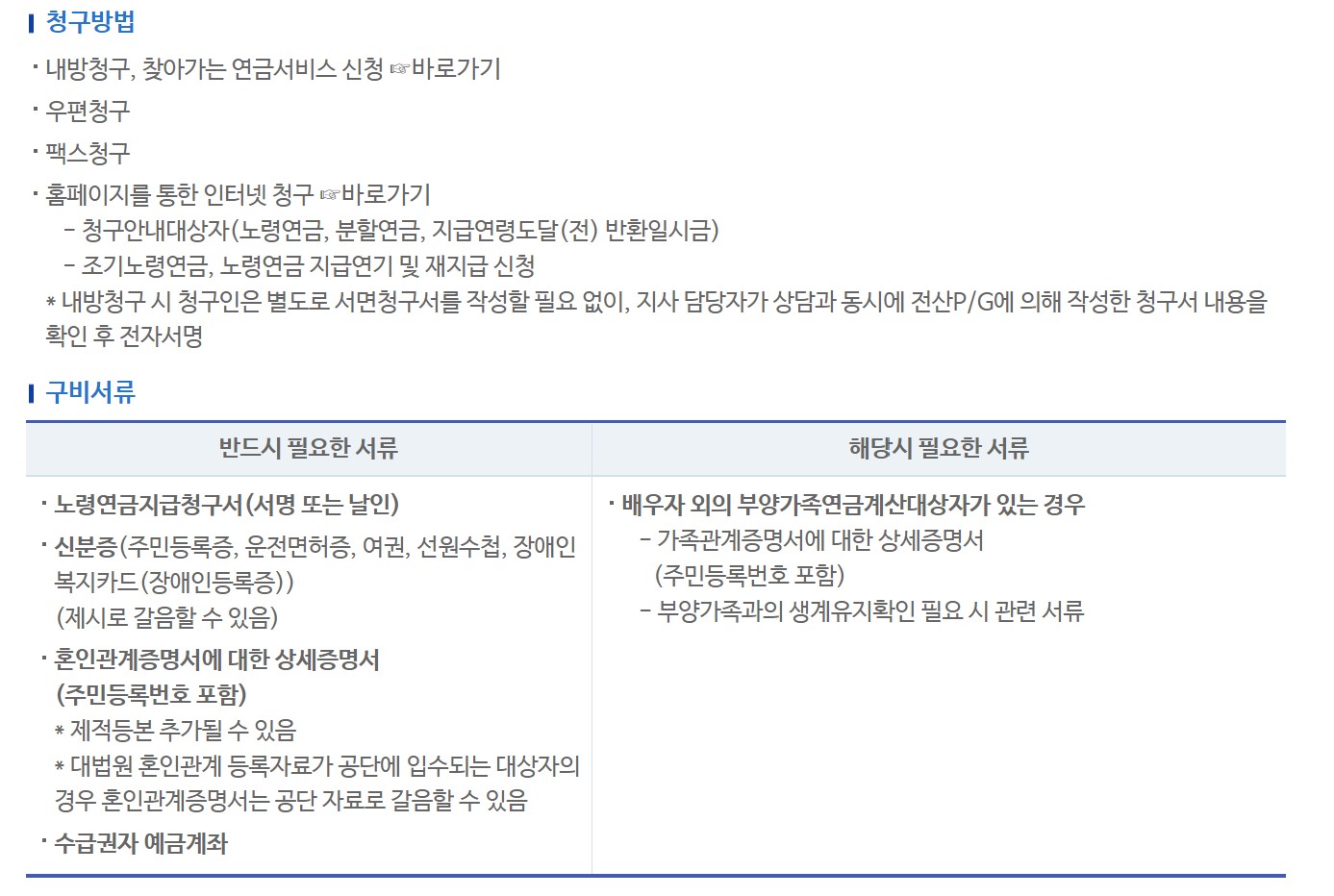 ✔ 노령연금 청구방법은 온라인, 우편, 팩스를 통해 신청이 가능하며, 구비서류는 아래와 같습니다.