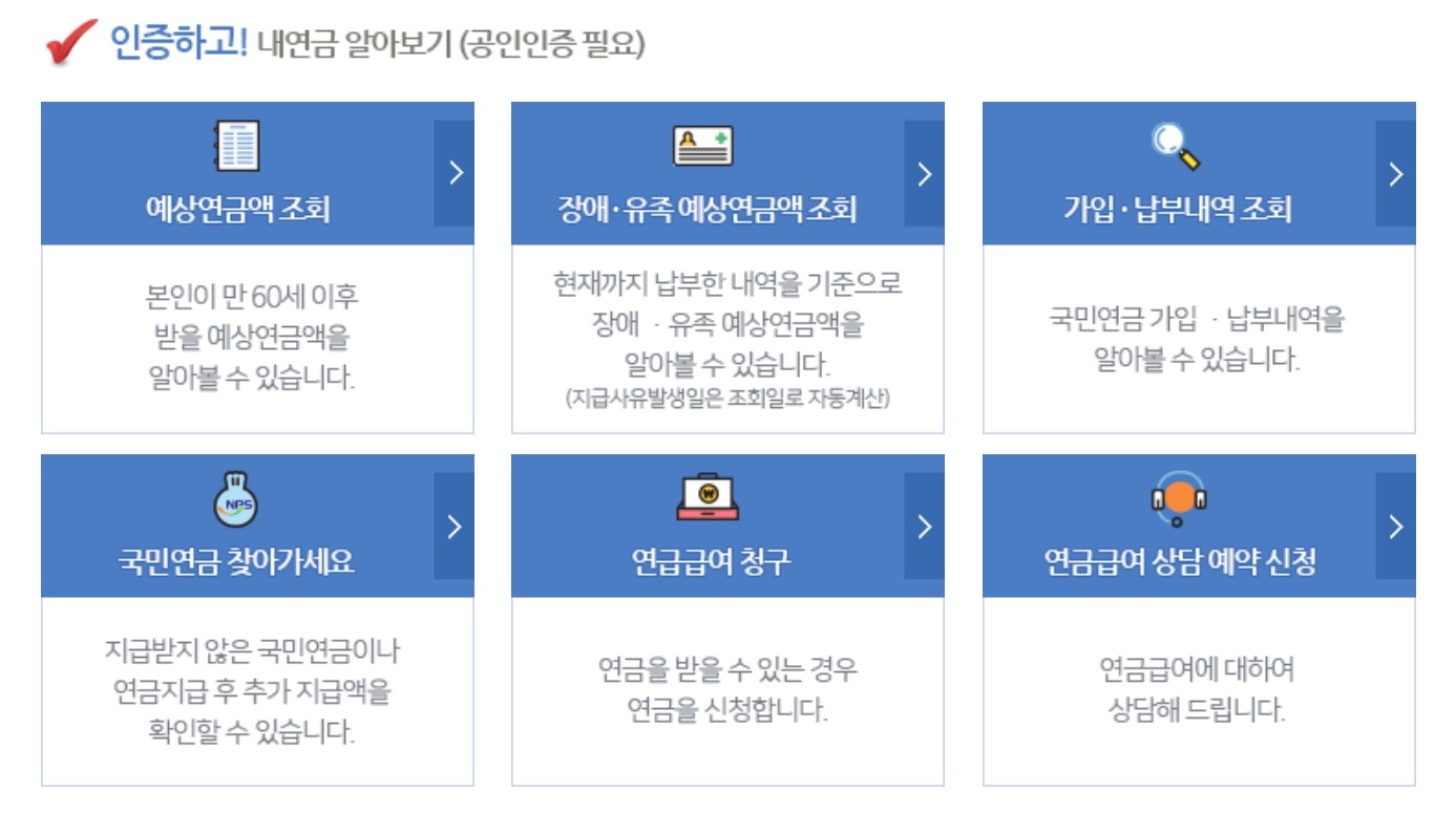 ✔ 만60세 이후 받을 예상연금액 알아볼 수 있는 예상연금액 조회 등 국민연금 조기수령액 알아보기를 할 수 있겠습니다. 이 외에도 장애, 유족 예상연금액, 연금급여 청구 등 여러 서비스가 있으니 희망하시는 서비스를 이용하시면 되겠습니다.