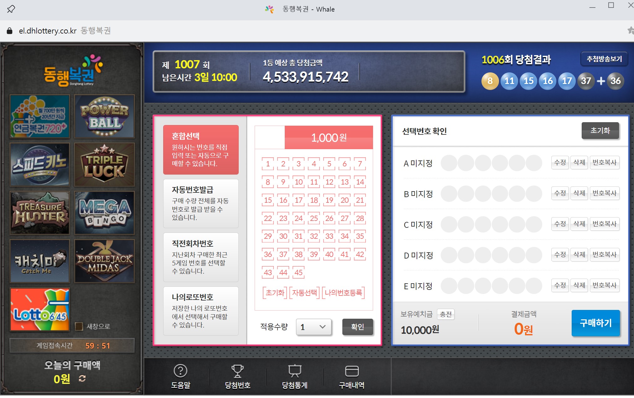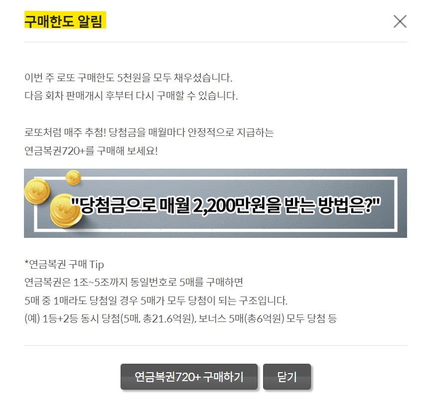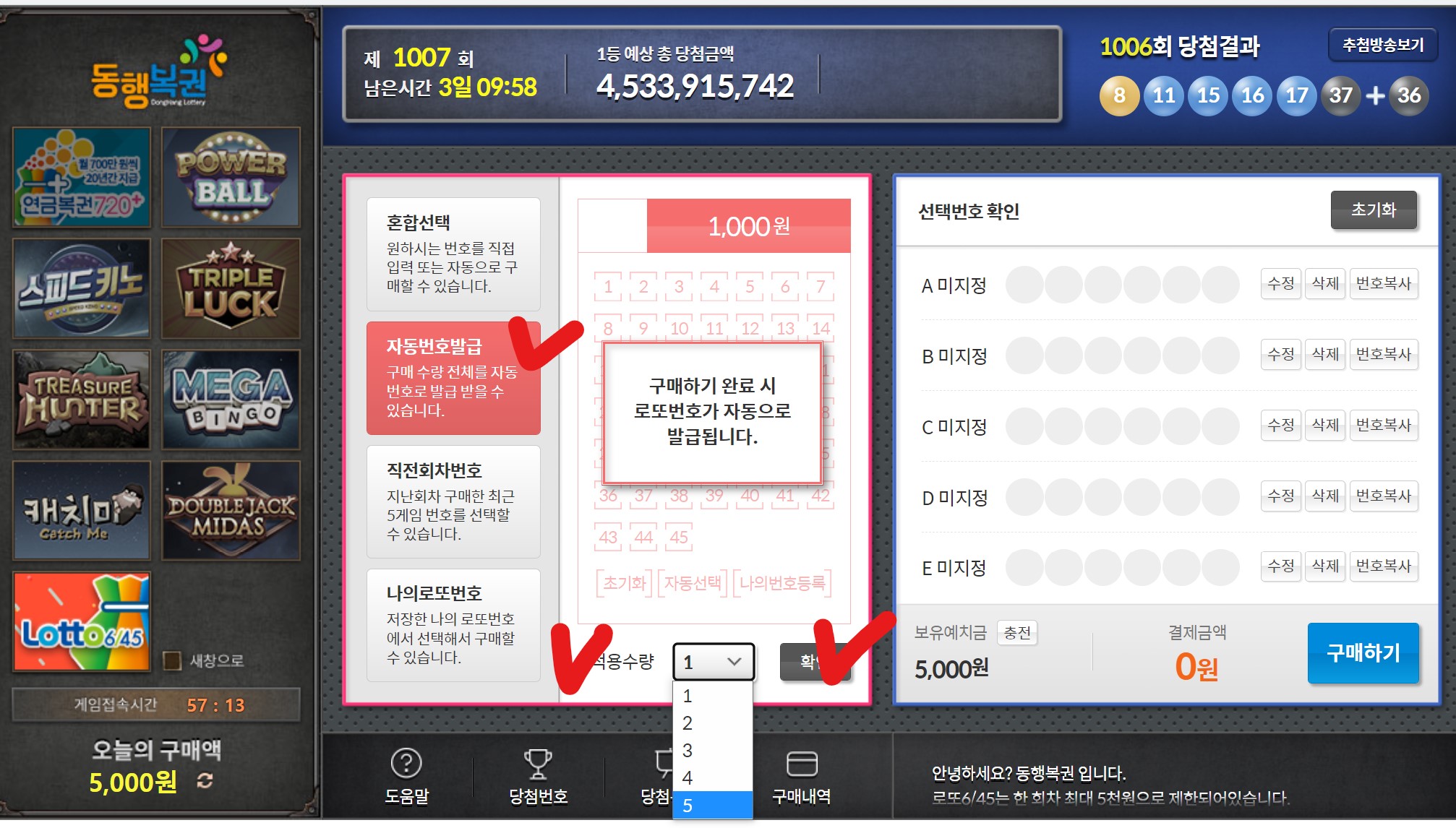 ※ 온라인 로또 구매한도는 5,000원입니다.