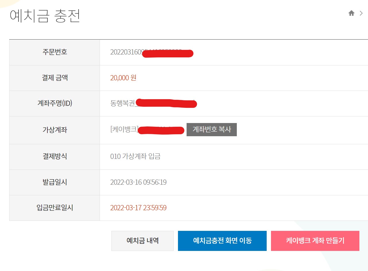 그러면 입금계좌, 입금금액이 나온 뒤 주문하기 버튼을 누르면 예치금 충전 내역이 나옵니다.