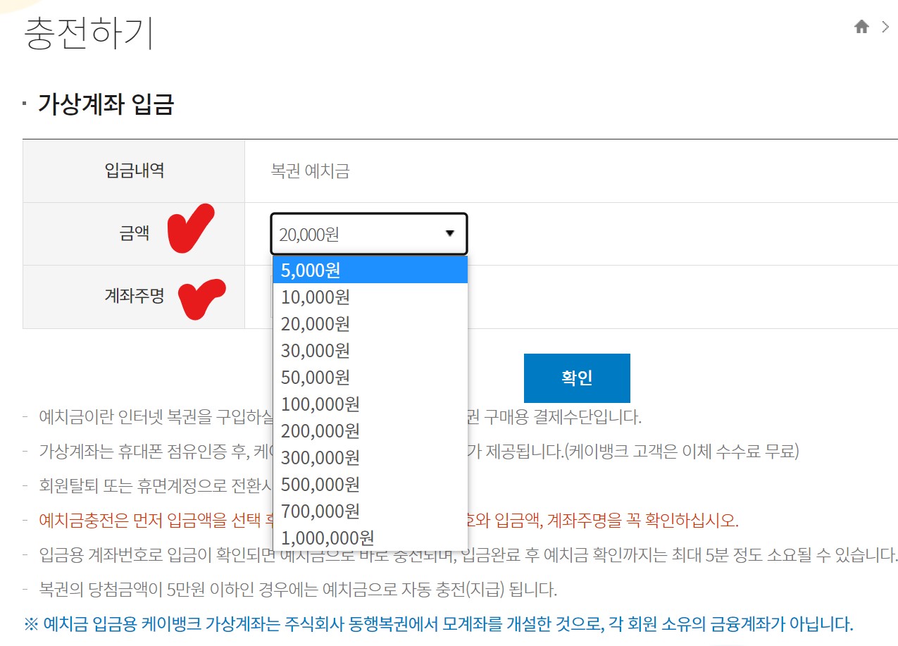 2. 충전하기를 누르면 금액, 계좌주명이 나옵니다. 충전하고자 하는 금액을 누른뒤 확인을 눌러줍니다. 그러면 핸드폰 번호로 입금 계좌가 생성되어, 핸드폰번호를 입력 후 인증번호 발송, 서비스 동의 후 입금계좌 생성을 클릭합니다.