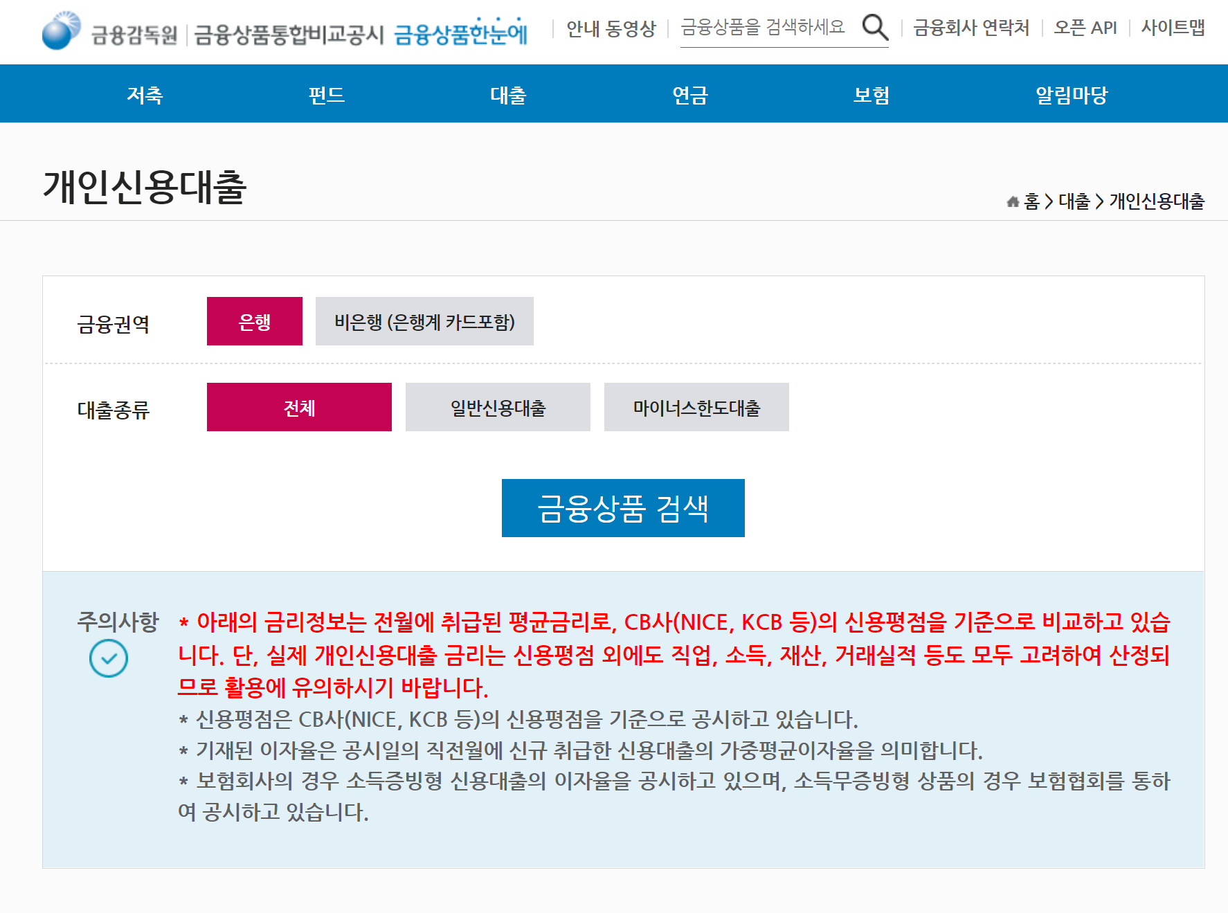 금융감독원 홈페이지 - 대출 - 개인신용대출 - 금융상품 검색을 통해 확인이 가능합니다.