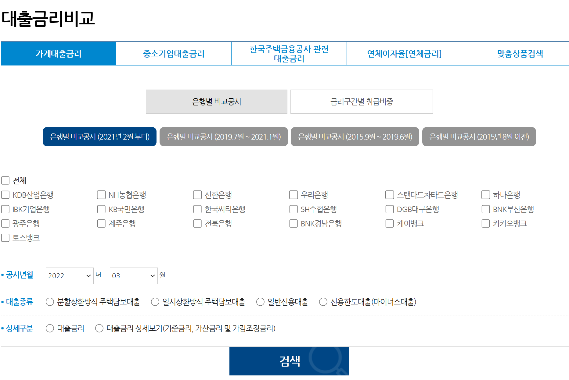 은행별, 기간별 비교공시 검색이 가능하며 은행, 대출종류, 상세구분 등을 통해 내가 찾고자 하는 은행의 금리를 알아볼 수 있어 보기 쉽습니다.