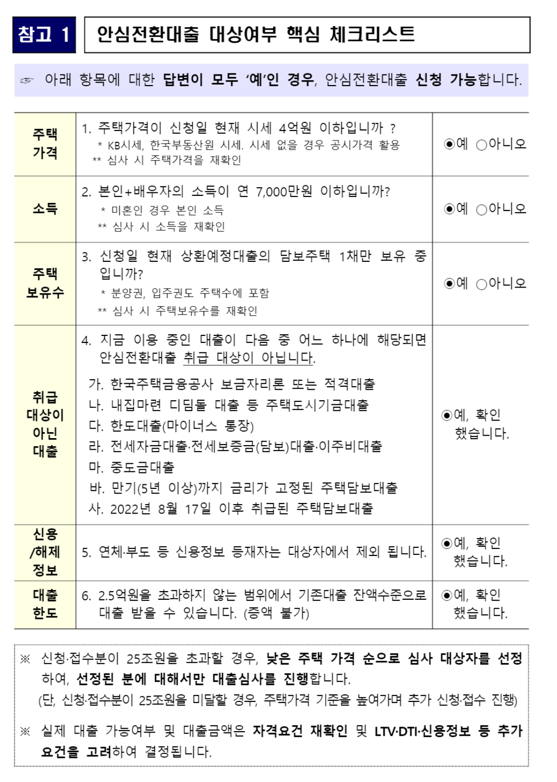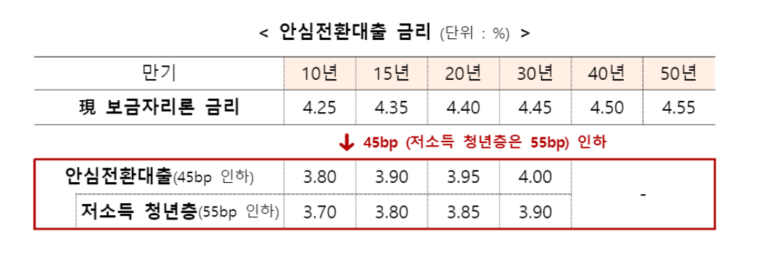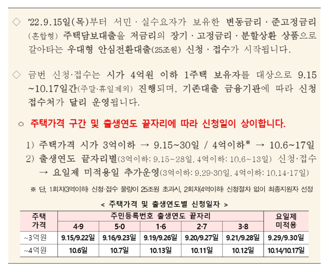 금융위원회는 9월 15일부터 서민, 실수요자가 보유한 대출을 저금리 상품으로 갈아타는 이른바 우대형 <안심전환대출> 신청을 받겠다고 밝혔습니다. 안심전환대출 자격, 대상에 대해 많이들 궁금해하실텐데요. 안심전환대출 자격 신청대상 신청방법(주택금융공사 홈페이지)에 대해 아래에서 자세히 안내드리겠습니다.