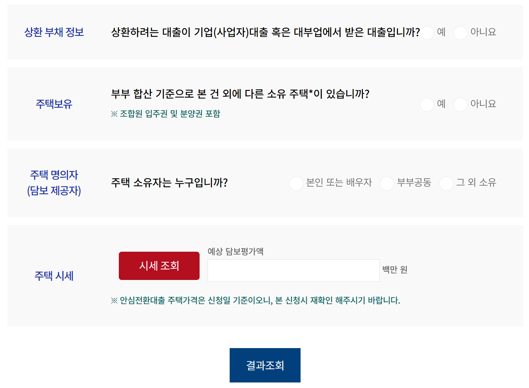 정확히 본인이 안심전환대출 자격이 맞는지 확실히 모르겠다면, 아래 주택금융공사에서 준비한 <안심전환대출 신청자격> 확인하기를 진행해보시기 바랍니다.