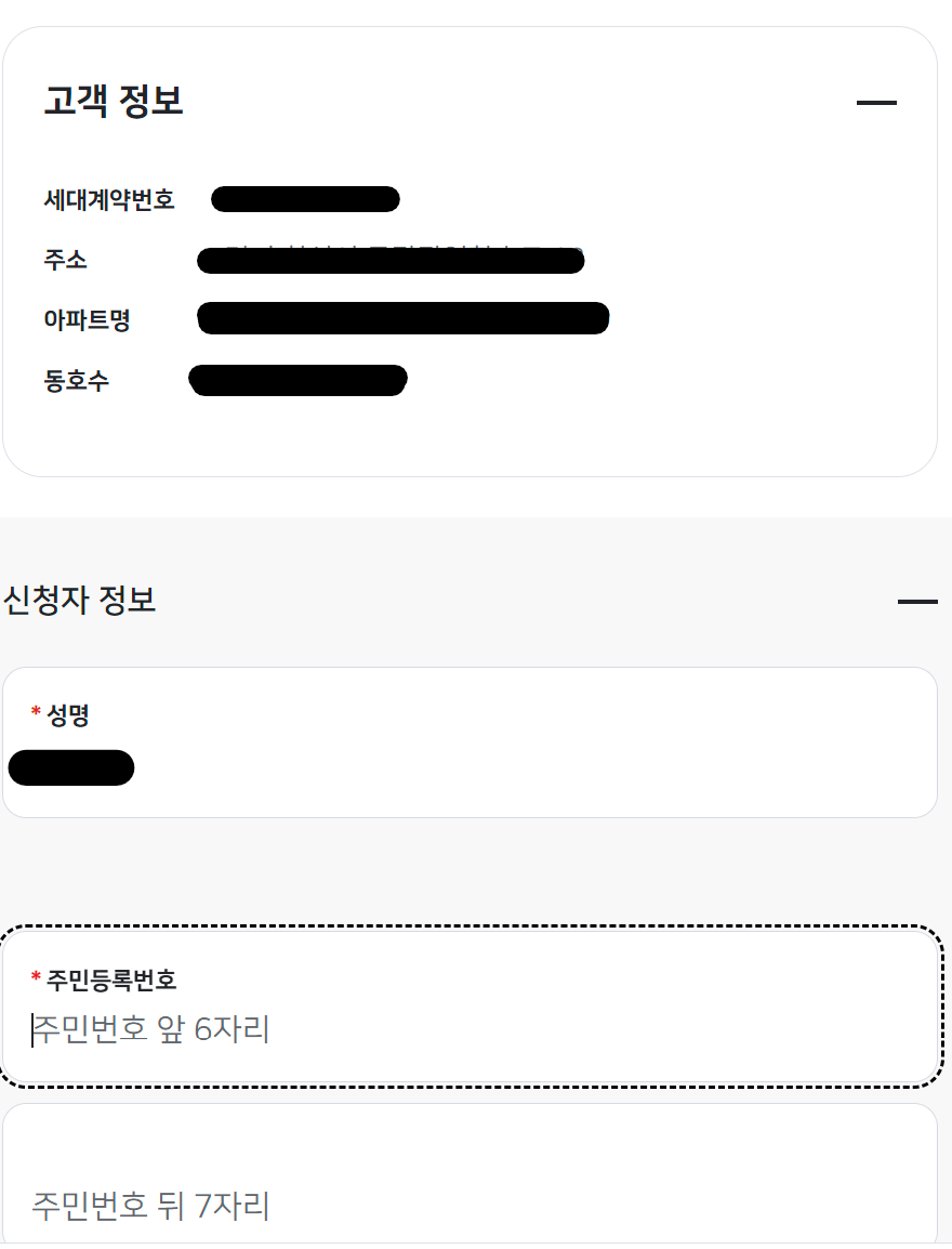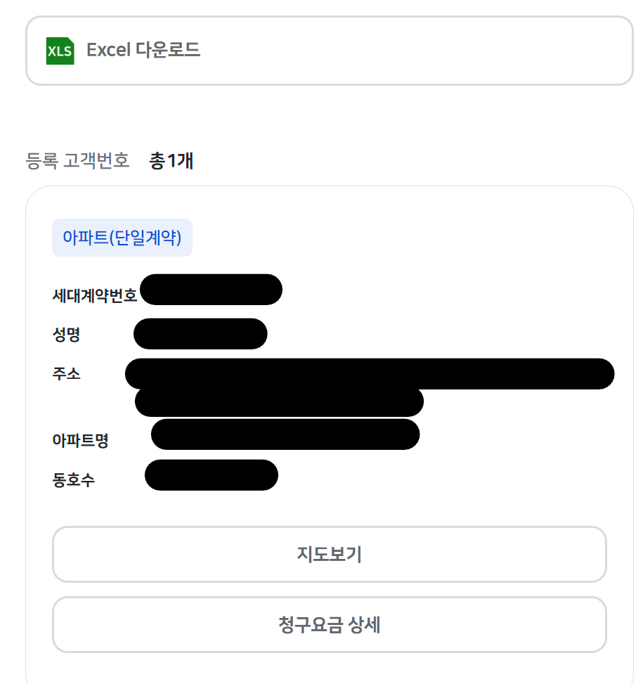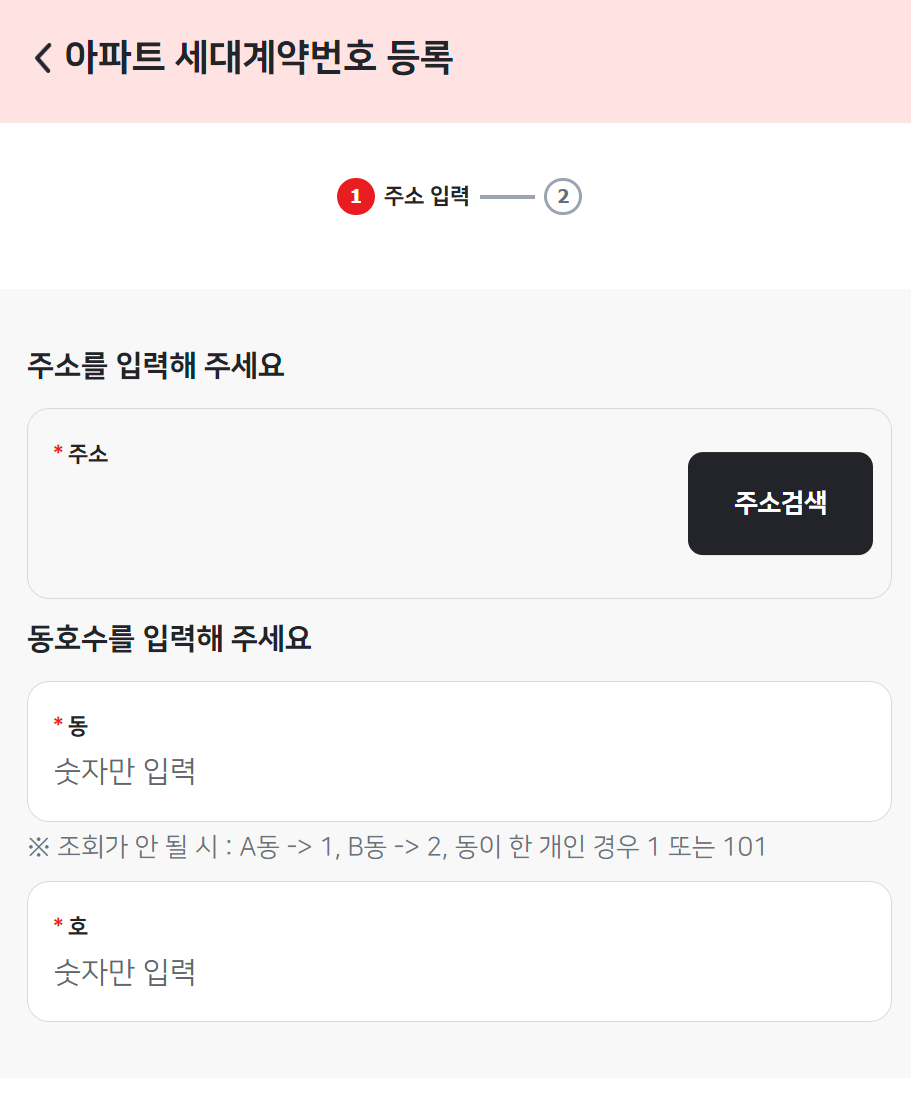 3. 클릭 후 주소 기입 후 본인인증을 진행하면 세대계약번호 등록이 완료됩니다.
