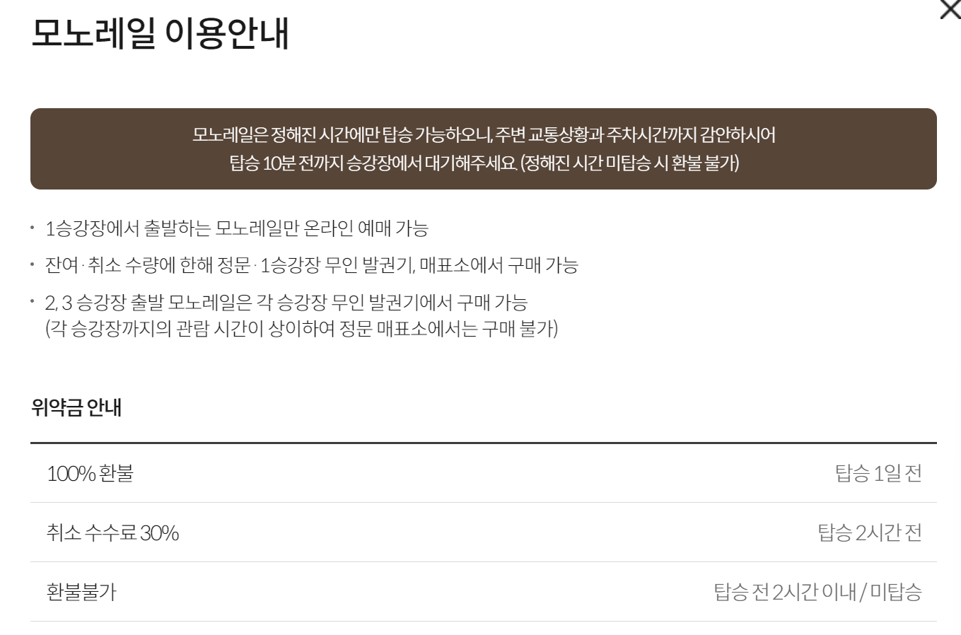 모노레일은 정해진 탑승에만 탑승 가능하고, 10분전까지 대기해야합니다. 시간이 지나면 탑승이 불가능하니 여유있게 예약하시는게 좋아요.